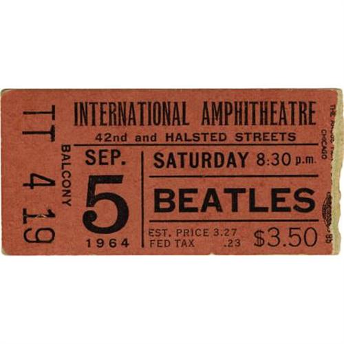 <B>Beatles International Amphitheatre 1964 Ticket Stub.</B></I> A brown balcony stub from their September 5, 1964 performance at the International in Chicago. In Fine to Very Fine condition with tearing along the right edge and some overall corner and edge wear.<BR><BR><b>Shipping:</b> Flat Material, Small (<a target="_blank" href="http://www.heritageauctions.com/common/shipping.php">view shipping information</a>)