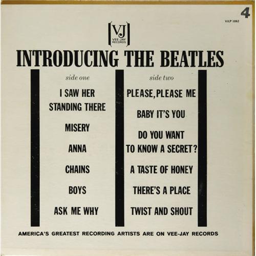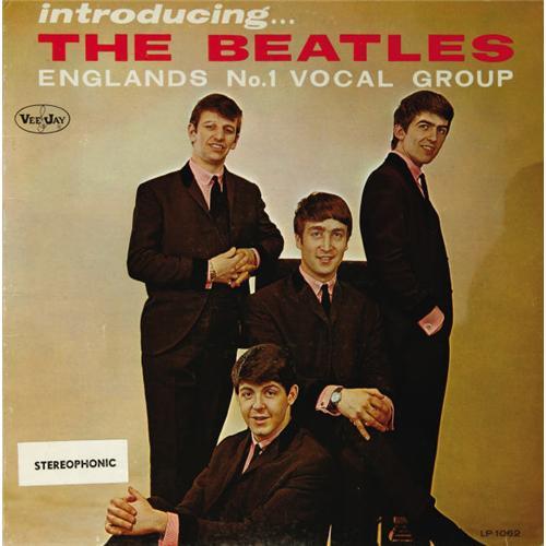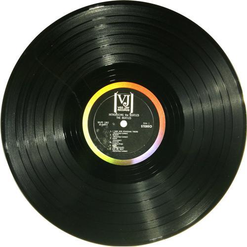 <B>"Introducing The Beatles" Stereo LP Vee-Jay 1062 (1964).</B></I> "Please Please Me" version with white stereophonic sticker on front cover. Back cover has "4" printed in top right corner. Black rainbow label with white Vee-Jay brackets. Condition: EX 7/ EX 7. <I>From the GRT Collection</B></I>.