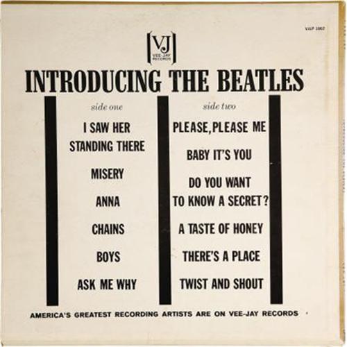 <B>"Introducing The Beatles" Mono LP (Vee-Jay 1062, 1963)</B></I> Here is a 1963 mono copy of the above LP with color band bracket labels. Small stain on back cover. Column back containing the songs "Ask Me Why" and "Please Please Me." Over the years it has become harder and harder to find nice copies of this milestone LP. After all, who didn't play (and play and play...) their Beatles albums in the 1960s? Condition: EX 7/ EX 7. <I>From the Bill Paquin Collection.</B></I><BR><BR><b>Shipping:</b> Recordings (<a target="_blank" href="http://www.heritageauctions.com/common/shipping.php">view shipping information</a>)