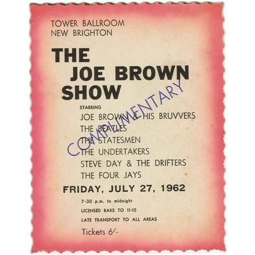 <B>Beatles/Joe Brown Show Ticket.</B></I> This comp ticket is from the July 27, 1962, performance of the "Joe Brown Show," featuring Joe Brown and his Bruvvers, with the Beatles receiving second billing as one of the opening acts. The performance was the first of two consecutive shows promoted by Brian Epstein; at the time Brown held the #3 spot on the charts with the single "A Picture of You," a song the Beatles had also added to their own setlist. The ticket is in Very Fine condition with very minor were to the edges, a few minor spots of discoloration on the front, and nickel-sized adhesive pulls on the back.<I>Accompanied by LOA from PSA/DNA.</B></I> <BR><BR><B>Important notice:<