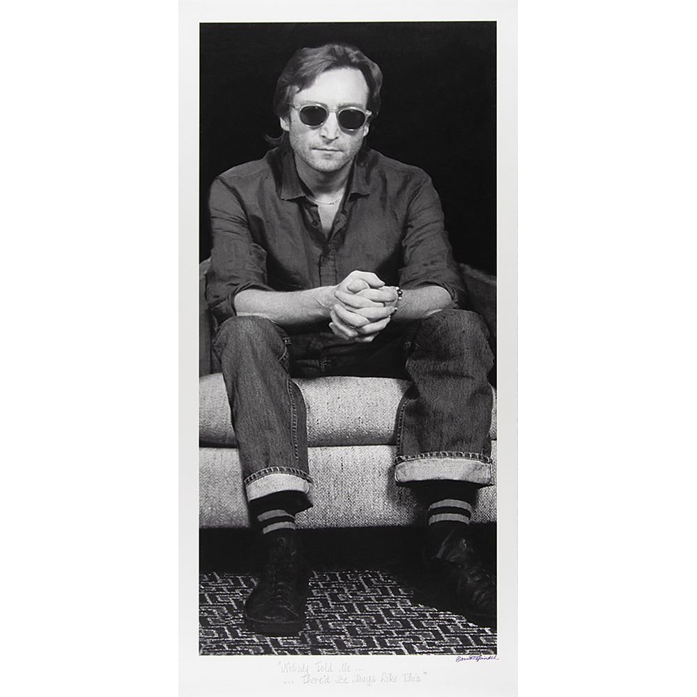 Limited edition 16.25 x 33 giclee print of a photograph of John Lennon taken by David Spindel entitled 'Nobody Told Me…There'd Be Days Like This,' depicting Lennon wearing sunglasses and seated with his hands clasped, signed in the lower right in ink by Spindel. The lower border also bears Spindel's photography blindstamp. Rolled and in fine condition. Spindel is perhaps best known for photographing John Lennon and Yoko Ono during Lennon's last recording sessions for Double Fantasy in 1980; he also co-created the poster for the Oscar-winning motion picture Platoon.