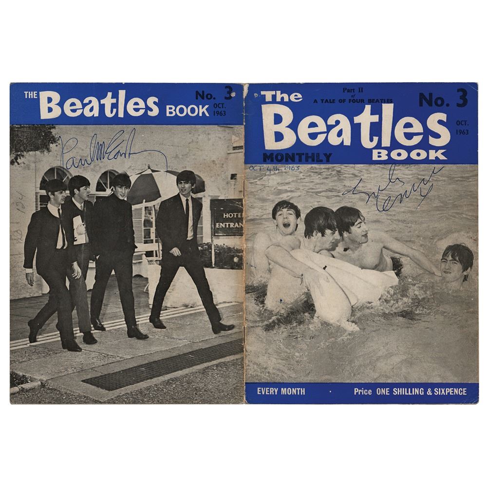 Monthly copy of The Beatles Book from October 1963, No. 3, 22 pages, 6 x 8.25, with the front cover depicting the Beatles playing in a swimming pool, signed on the front cover in blue ballpoint, “John Lennon, x,” and on the back cover, “Paul McCartney.” Collector’s notation to the front cover dates the autographs to October 4, 1963, when the band were at the Television House in London, making their debut on the ITV television program ‘Ready Steady Go.’ In fine condition, with light handling wear, toning along the spine, and various fan notations throughout.