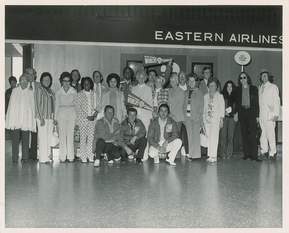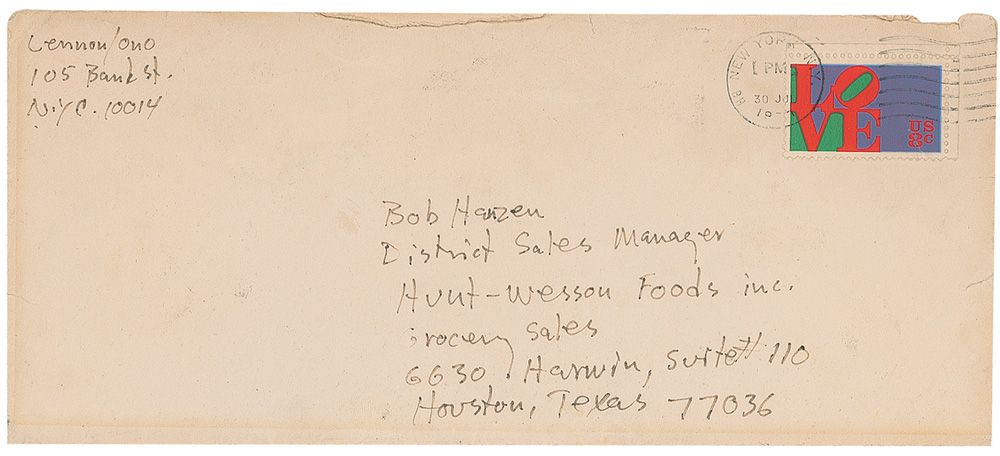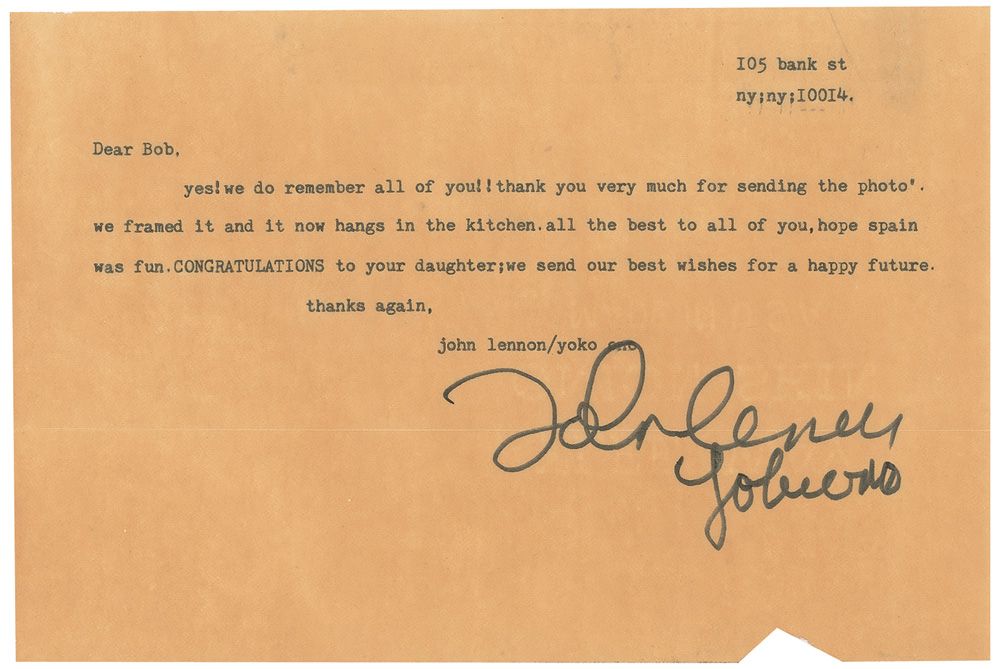 Two pieces of correspondence sent to a former employee of Hunt-Wesson foods named Bob Hanzen. An ANS, signed “John Lennon,” one page, 5.25 x 5.25, no date. Lennon writes, in full: “H. Food. Dear. Bob Hanson [sic] The address for the photo is Lennon 105 Bank ST N.Y. N.Y. 10014. Thank you have a good trip ole!” Second is a TLS, signed “John Lennon Yoko Ono,” all signed by Lennon, one page, 8 x 5.25, no date. Letter to Hanzen reads, in full (with spelling and grammar retained): “Dear Bob, yes! we do remember all of you! Thank you very much for sending the photo we framed it and it now hangs in the kitchen. all the best to all of you, hope spain was fun. Congratulations to your daughter; we send our best wishes for a happy future. Thanks again.” Accompanied by the original mailing envelope, postmarked July 30, 1973, addressed in Lennon’s hand to Hanzen, and signed in the return address area “Lennon/Ono, 105 bank St. N.Y.C. 10014.” Also included is a group photo of Hanzen and his travelling party posing at the Eastern Airlines ticket counter with Lennon and Ono. Uniform toning to both letters, intersecting folds to handwritten note, one through a single letter of signature, and some toning to envelope, otherwise fine condition. Hanzen obtained the items in 1973 after his sales team won a trip to Spain and by chance John and Yoko were on the same flight. Two great letters from Lennon, who was enjoying living in his Bank Street apartment, even though he and Yoko were under FBI surveillance as the government was attempting to deport Lennon to England.
