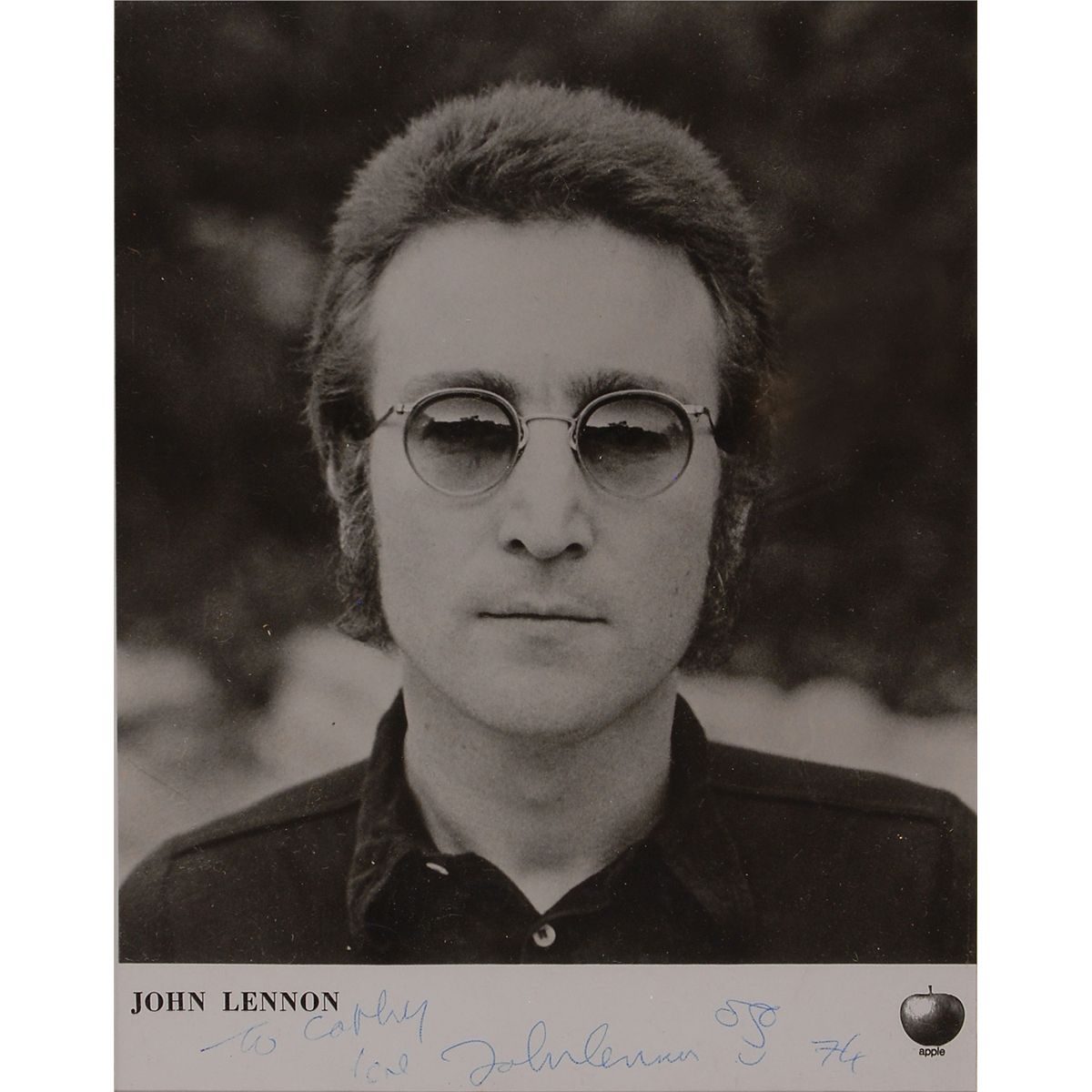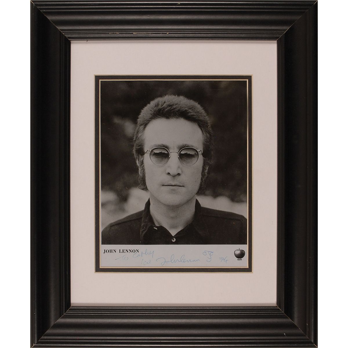 Desirable glossy 8 x 10 Apple publicity head-and-shoulders photo of Lennon in a dark shirt and sunglasses, signed and inscribed in the lower border in blue ballpoint “To Cathy, Love, John Lennon 74,” adding a small caricature after his signature. Double-matted and framed to an overall size of 14.5 x 17.5. In fine condition, with scattered light surface creases. It appears this portrait was the basis for the sleeve cover art of Lennon’s single ‘Mind Games.’ Provenance: Christie’s 2008.