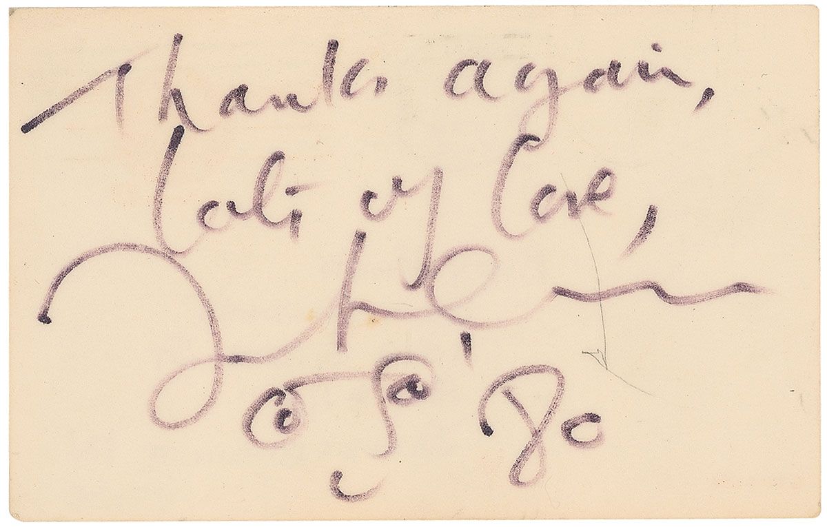 Felt tip signature, “Thanks again, lots of love, John Lennon ’80,” adding a great self-portrait caricature under his signature, on a 5.5 x 3.5 postcard (postmarked 3/4/1980). The postcard has been completely laminated. In fine condition, with a couple of expected light bends.