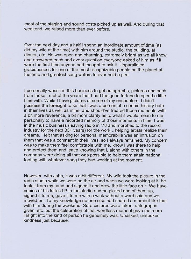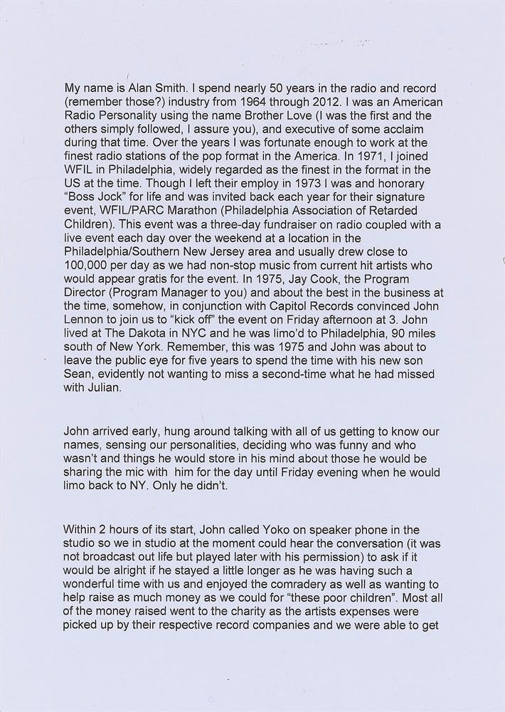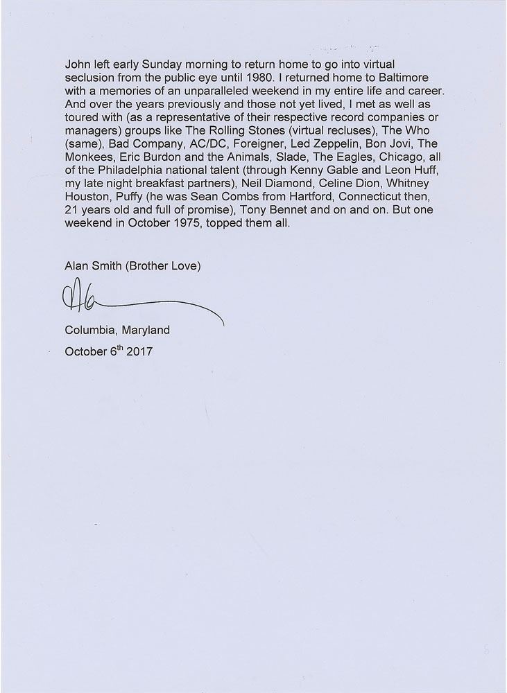 Rock 'n' Roll album signed and inscribed on the front cover in blue ballpoint, "To Brother Love, Love, John Lennon, '75" with a small doodle below. In fine condition, with a discount hole to the upper right corner and partial separation to lower edge. The record is included. Accompanied by a lengthy letter of provenance from the original recipient, Alan Smith, who was an American radio personality under the name 'Brother Love.' He describes acquiring the autograph at a WFIL/PARC marathon charity event in 1975, in part: "Jay Cook, the Program Director…somehow, in conjunction with Capitol Records convinced John Lennon to join us to 'kick off' the event on Friday afternoon…John arrived early, hung around talking with all of us getting to know our names, sensing our personalities, deciding who was funny and who wasn't and things he would store in his mind about those he would be sharing the mic with…Within 2 hours of its start, John called Yoko on speaker phone in the studio…to ask if it would be alright if he stayed a little longer as he was having such a wonderful time with us and enjoyed the comradery as well as wanting to help raise as much money as we could for 'these poor children'…Over the next day and a half I spent an inordinate amount of time (as did my wife at the time) with him around the studio, the building, at dinner, etc. He was open and charming, extremely bright as we all know, and answered each and every question everyone asked him as if it were the first time anyone had thought to ask it. Unparalleled graciousness for one of the most recognizable people on the planet at the time and greatest songwriters to ever hold a pen…We have copies of his latest LP in the studio and he picked one of them up, signed it to me, gave it to me with a wink without a word said and we moved on…The celebration of that wordless moment gave me more insight into the kind of person he genuinely was. Unasked, unspoken kindness just because."