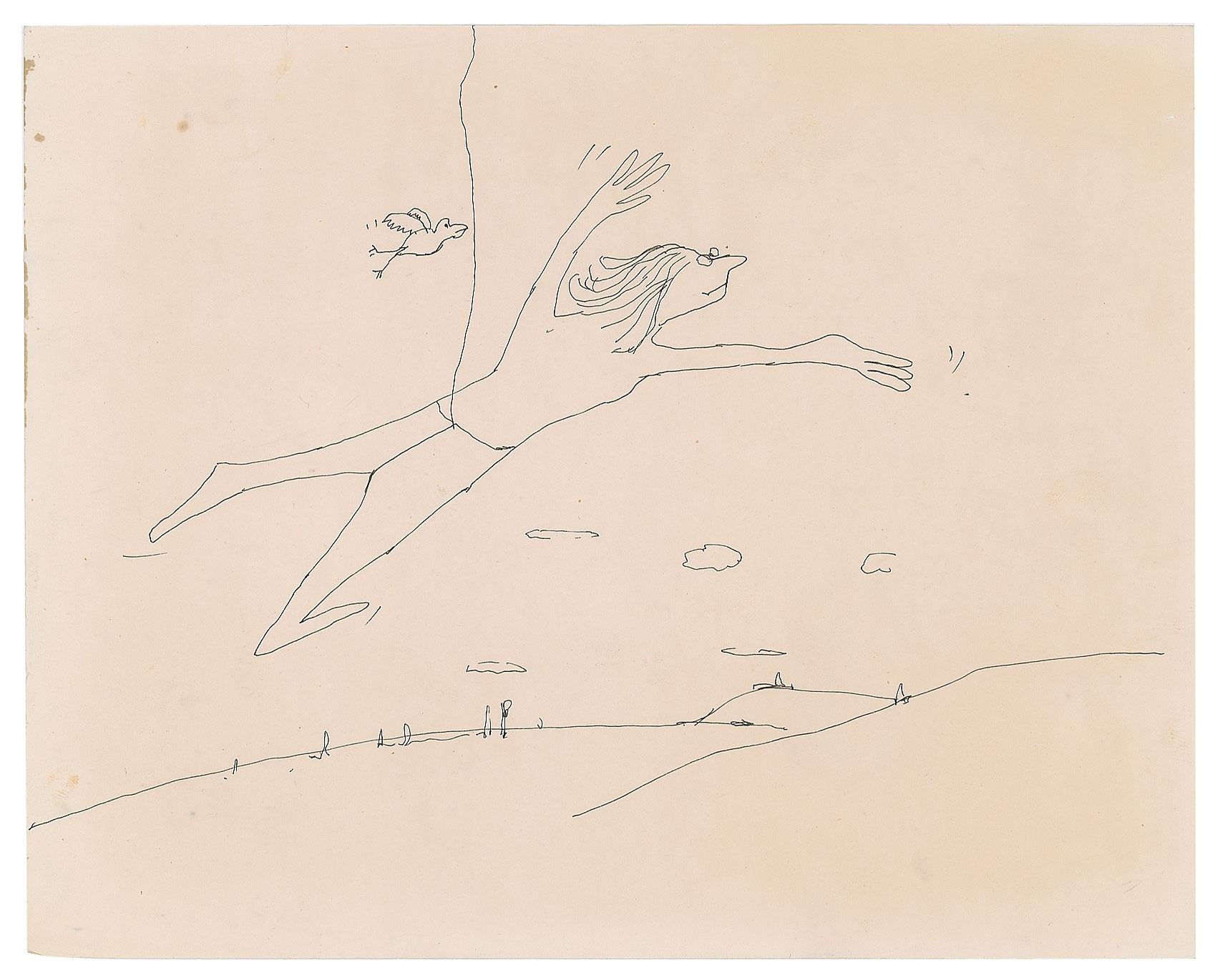 Brilliant original ink sketch by John Lennon, unsigned, entitled 'Lady Flying on a Wire,' penned on an off-white 10 x 8 sheet, which depicts a bespectacled figure—looking eerily similar to Lennon himself—with wire strung about their waist, flying through the air with outstretched arms high above rolling country hills, with clouds visible in the distance and a small bird flapping nearby. In fine condition, with some faint creasing.