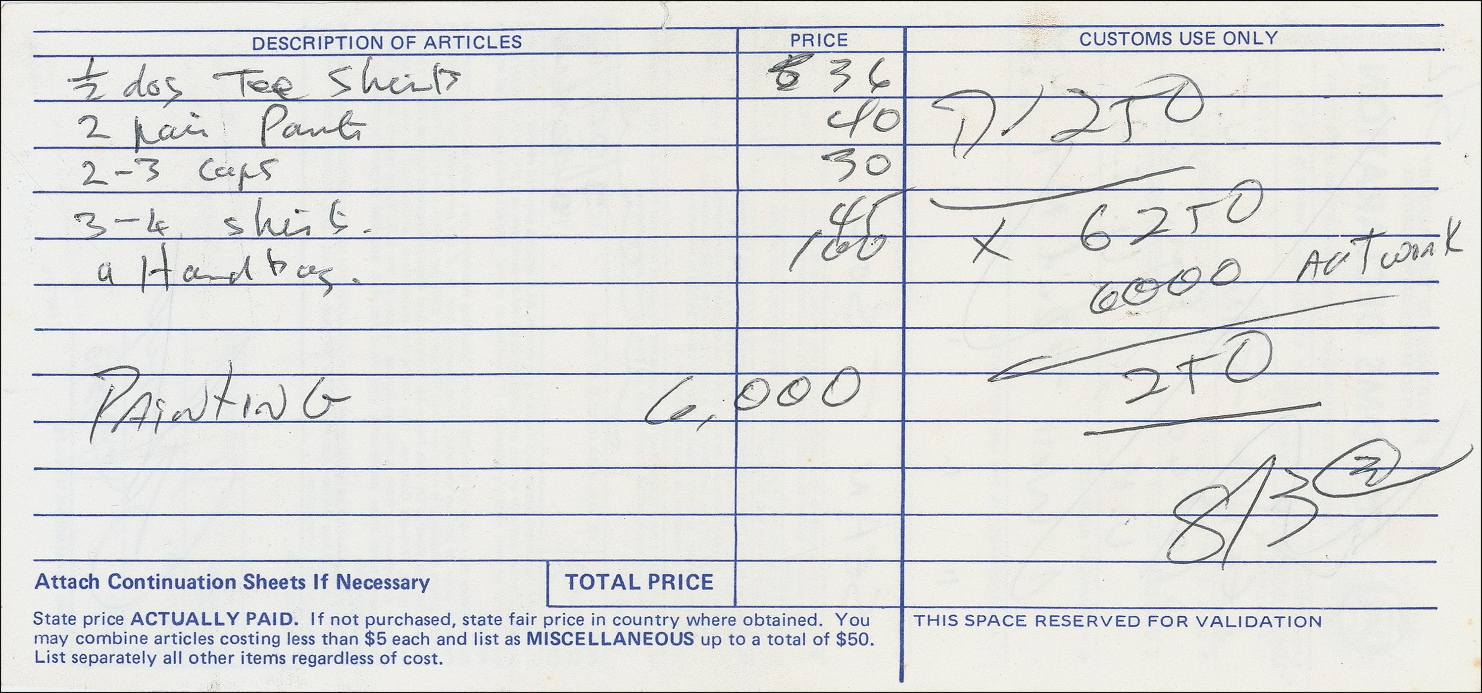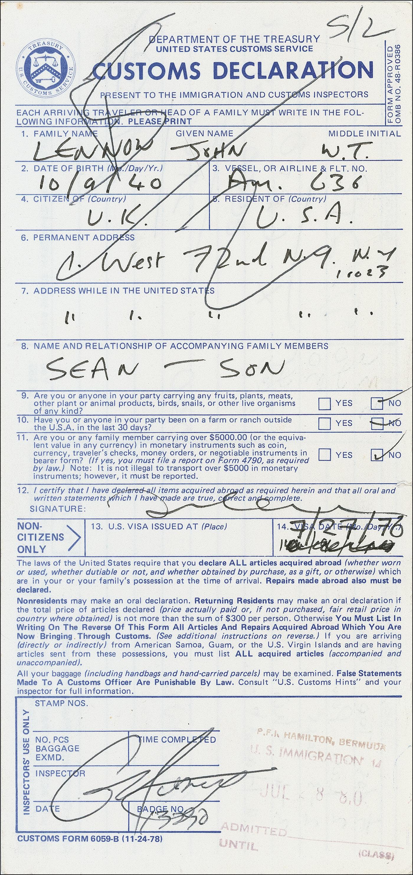 DS, one page both sides, 4 x 8.5, stamp dated July 28, 1980. A United States Customs Declaration form, filled out and signed by Lennon, as he returned from a working vacation in Bermuda; he had sailed to Bermuda in June and spent two months there in the summer writing most of the songs for his final album Double Fantasy, which would be released on November 17, 1980. Lennon has filled out his name, date of birth, his countries of residence and citizenship, his New York address at the Dakota, his flight information, the date he became a United States citizen; he also notes that he is traveling with his son, Sean. On the reverse Lennon lists the items he purchased in Bermuda, including half a dozen t-shirts, two pairs of pants, 2–3 caps, 3–4 shirts, a hand bag, and a commissioned painting of him and Sean valued at $6,000.