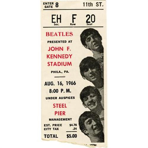 <B>Beatles Kennedy Stadium 1966 Ticket Stub.</B></I> Almost constant lightning threatened to cut this show short, but fortunately for 21,000 Beatles fans, the run held off until shortly after the show ended. This white general admission ticket stub is in Very Fine condition with mild creasing to the top left corner, very minor edge and corner wear, and tearing along the lower edge.<BR><BR><b>Shipping:</b> Flat Material, Small (<a target="_blank" href="http://www.heritageauctions.com/common/shipping.php">view shipping information</a>)