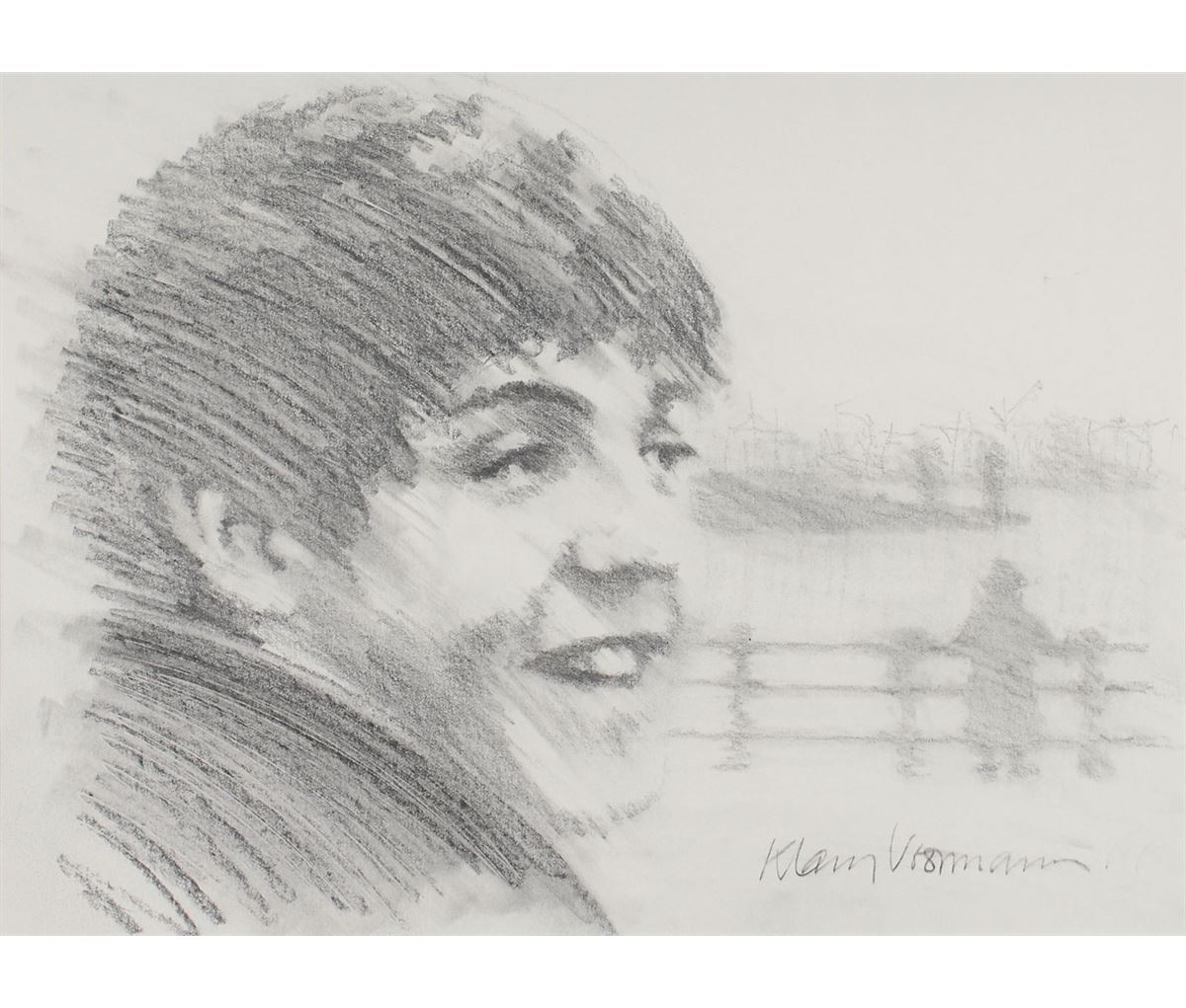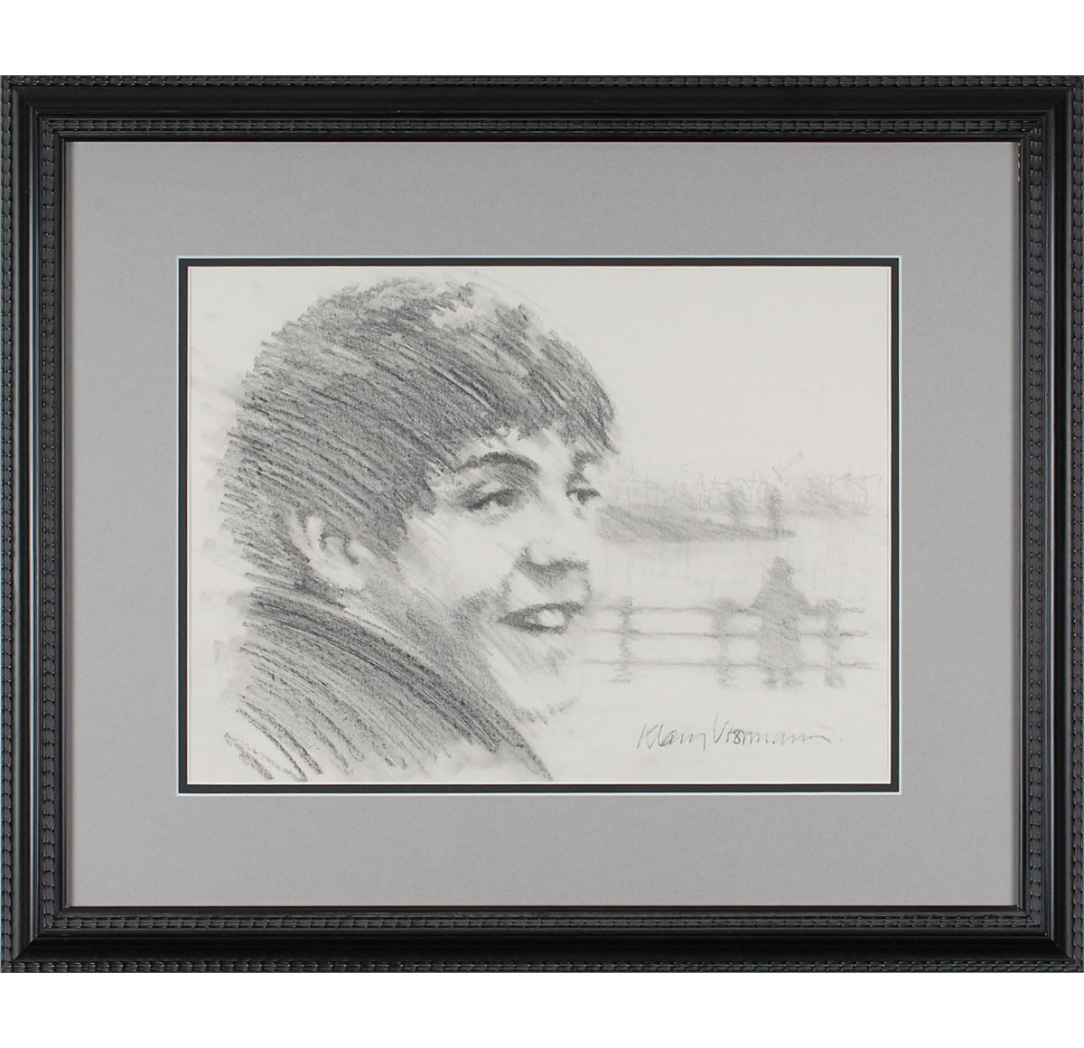 Original signed pencil sketch of Paul McCartney on a white 15.5 x 11.75 sheet, signed at the bottom in artist’s pencil by Voormann. Double-matted and framed, with archival quality mats and UV glass, to an overall size of 24.5 x 11.75. In fine condition. Oversized.