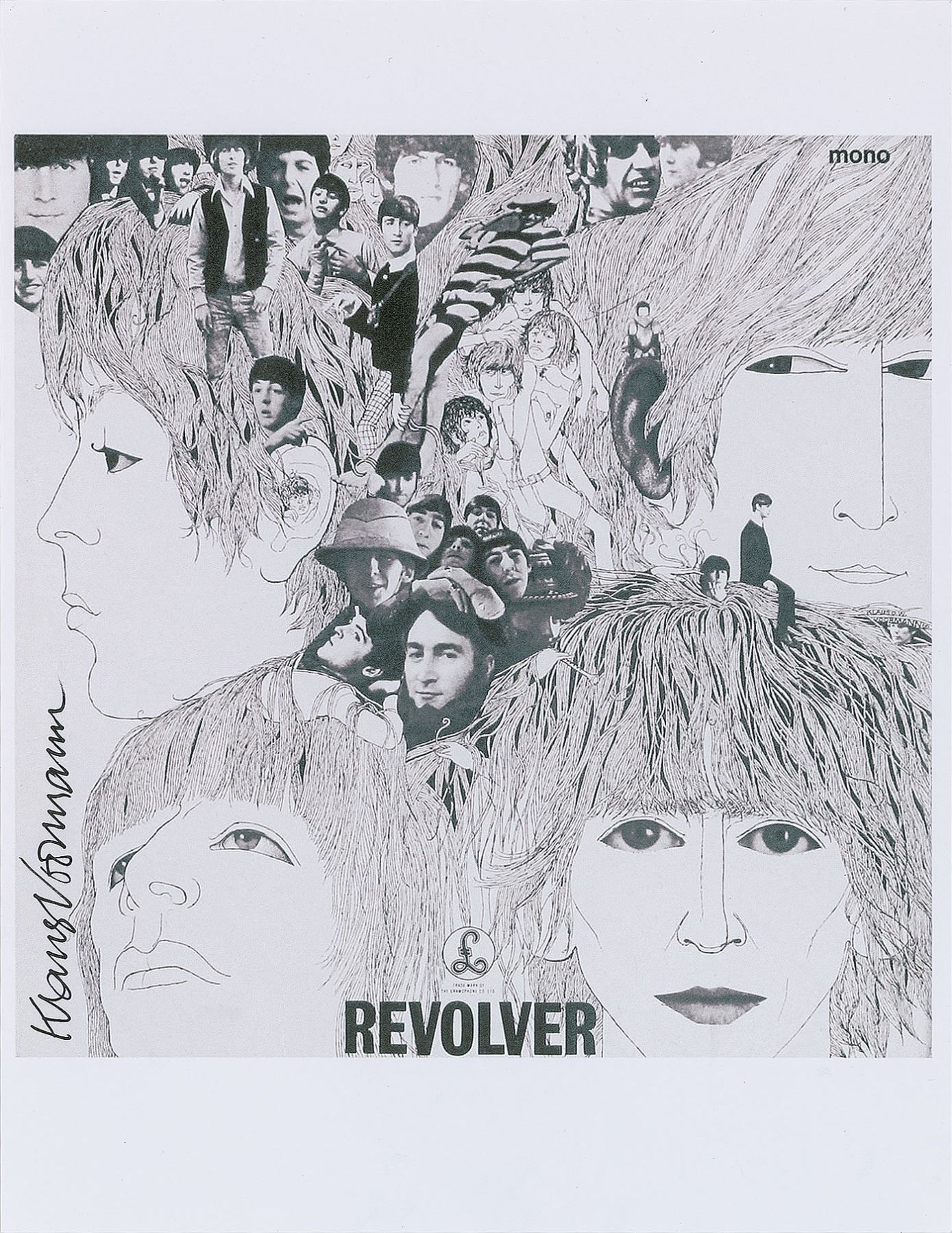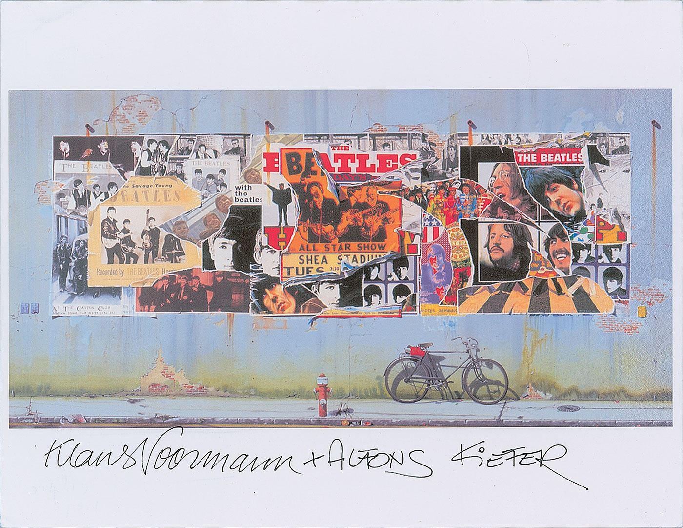 Two photos: a color 11 x 8.5 heavy paperstock photo of the primary design for The Beatles Anthology, signed in the lower border in black ink by Klaus Voormann and Alfons Kiefer; and an 8.5 x 11 heavy paperstock photo of the cover for the 1966 Beatles album Revolver, vertically signed in black ink by Voormann. In overall very fine condition.