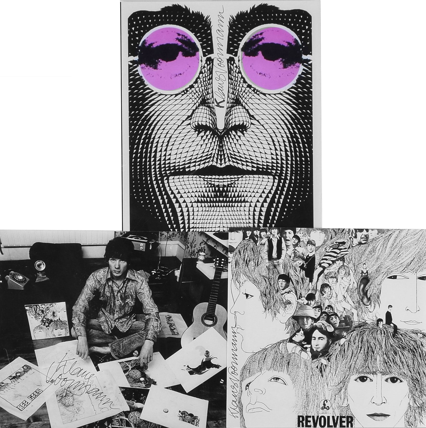 Three photos, glossy and satin-finish, ranging in size from 8 x 8 to 10 x 8, each signed in black felt tip by German artist Klaus Voormann, with images including: Voormann sitting on the floor of his studio next to various album designs; a stylized image of John Lennon with pink glasses; and the cover artwork for the Beatles' seventh studio album, Revolver. In overall very fine condition.