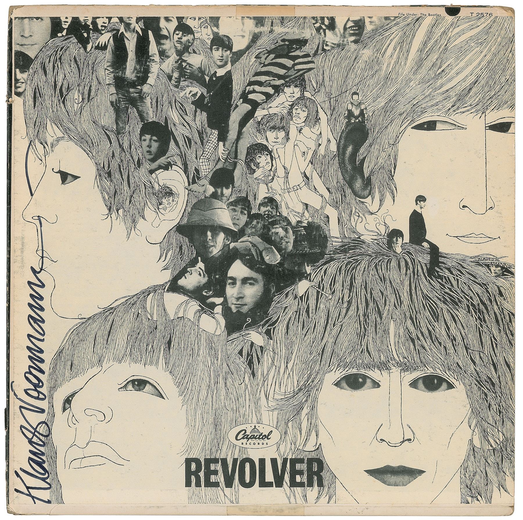 Revolver album by the Beatles, signed vertically on the front cover in black felt tip by its designer, Klaus Voormann. In very good condition, with light scuffing, edge wear, and small pieces of tape to the top and bottom edges. The record is not included.
