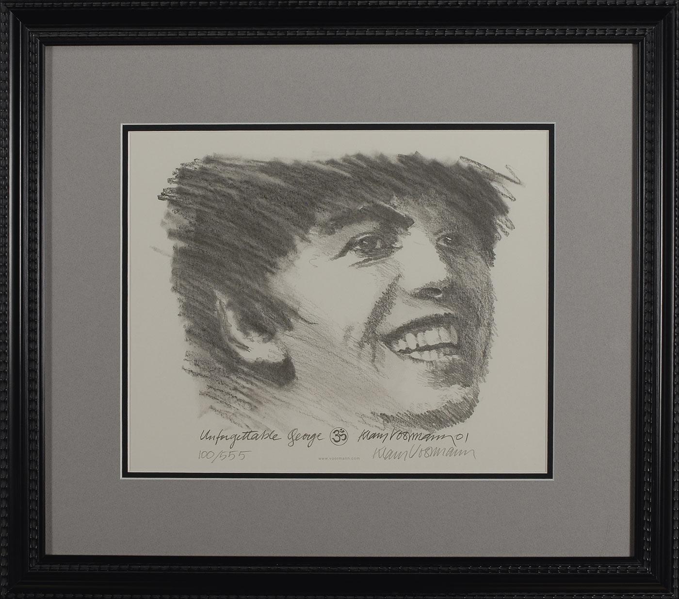 Limited edition 13.5 x 11 lithograph entitled “Unforgettable George,” numbered #100/555, signed in pencil by Voormann. Double matted and framed to an overall size of 22 x 19.75. In very fine condition. Pre-certified PSA/DNA and RRAuction COA.