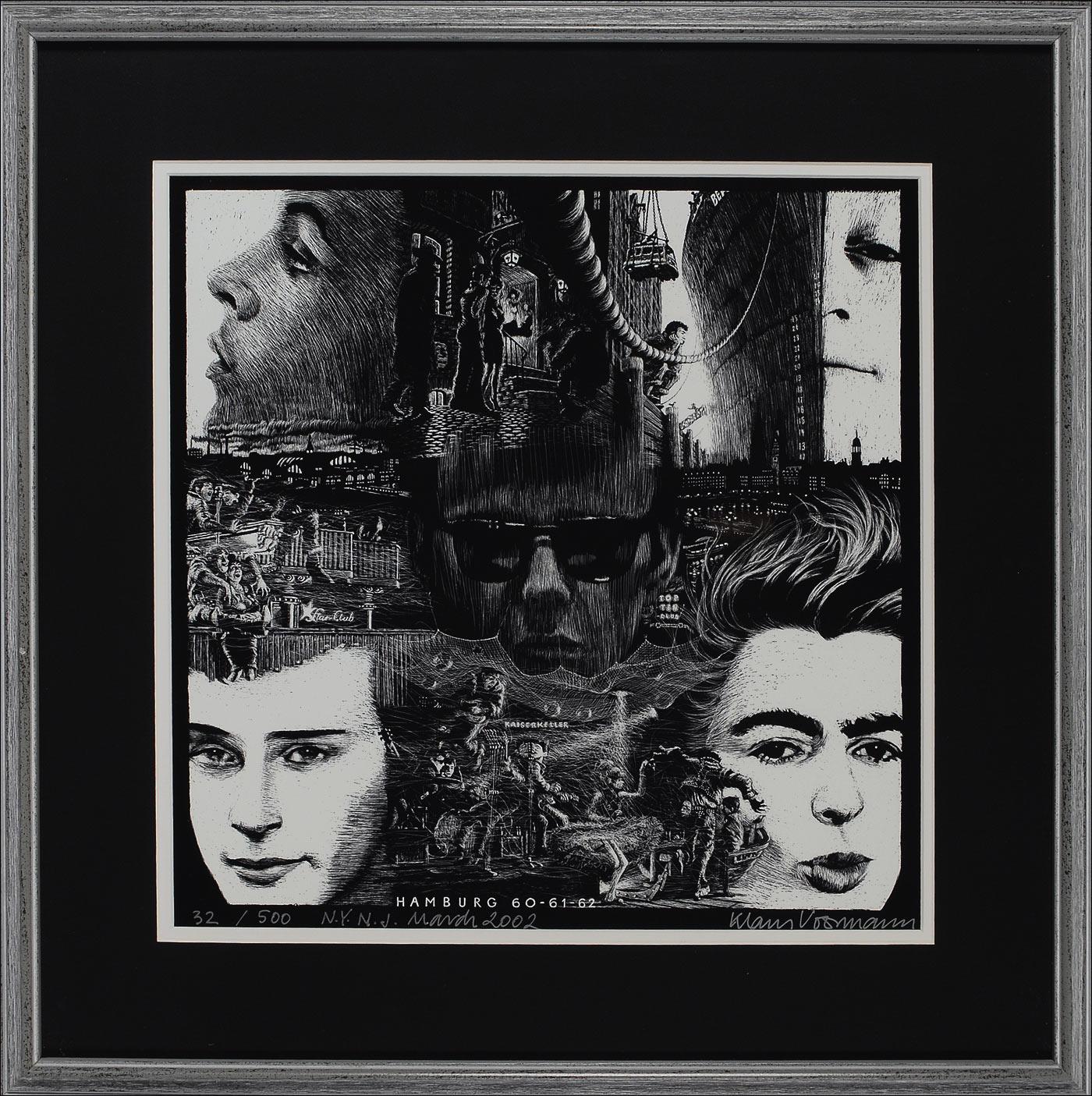 Limited edition 15.75 x 15.5 lithograph of the Beatles in Germany, entitled “Hamburg 60-61-62,” numbered #32/500, signed in silver ink, “Klaus Voormann” and dated “N.Y. N.J. March 2002.” Archivally double matted and framed to an overall size of 23.5 x 23.25. In very fine condition. Oversized.