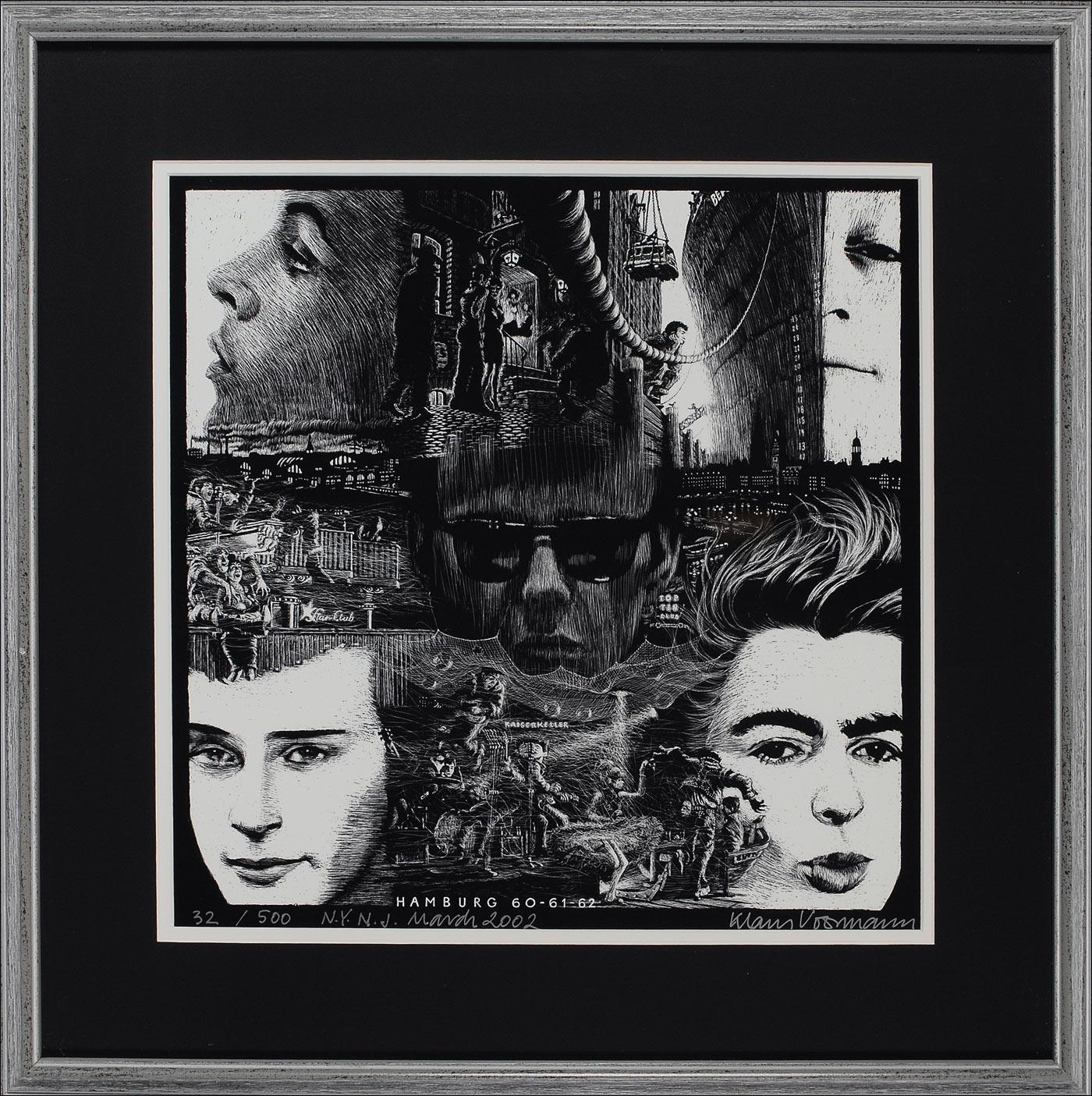Limited edition 15.75 x 15.5 lithograph of the Beatles in Germany, entitled “Hamburg 60-61-62,” numbered #32/500, signed in silver ink, “Klaus Voormann” and dated “N.Y. N.J. March 2002.” Archivally double matted and framed to an overall size of 23.5 x 23.25. In very fine condition. Oversized.