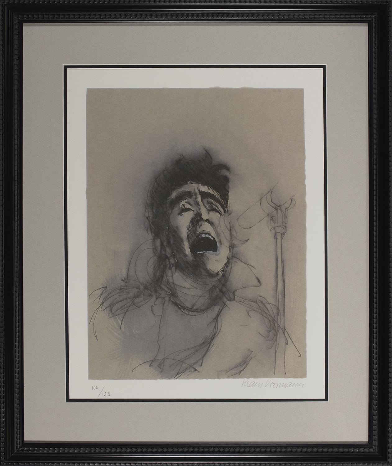 Limited edition 15.75 x 20.5 lithograph of John Lennon singing into a microphone while performing in Hamburg, Germany, numbered #104/125, signed in the lower border in pencil by Voormann. Double matted and framed to an overall size of 24.5 x 29. In very fine condition. Oversized.