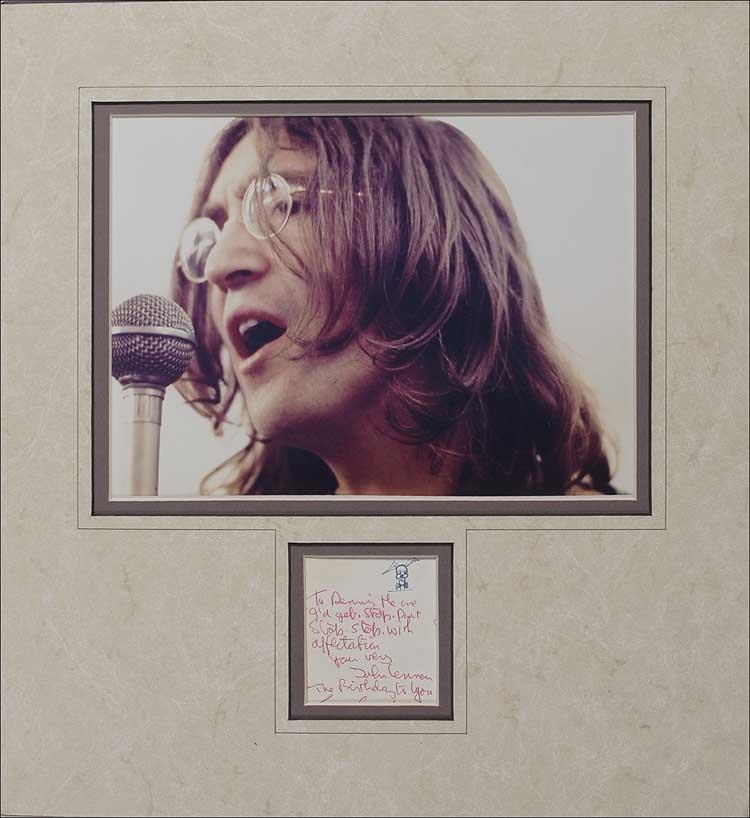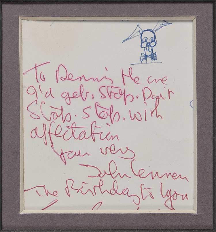 Vintage ballpoint signature and inscription, “To Dennis, The one I’d get. Stop. Don’t Stop. Stop. With affection, your very, John Lennon. The Birthday to you,” on an off-white 2.25 x 2.75 heavy stock slip. RRAuction expert Roger Epperson states that this slip was trimmed from a 1969 birthday card, which was originally signed by all four Beatles. Above the beginning of Lennon’s inscription, there is a small ballpoint sketch of a rabbit done by Paul McCartney. Double matted with a color photo of Lennon performing, to an overall size of 13 x 14. A few light creases, a bit of trivial running of ink to a couple of words of inscription, and a few stray ink marks to bottom edge, otherwise fine condition.
