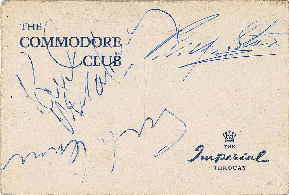 Vintage ballpoint signatures of John Lennon, Paul McCartney, and Ringo Starr on the reverse of an off-white 4.5 x 3 clipped menu from The Commodore Club at The Imperial Hotel in Torquay, United Kingdom. In very good condition, with scattered overall creasing, and ink skipping due to an obviously faulty pen. Accompanied by a letter of authenticity from noted Beatles expert Frank Caiazzo, in part: “These signatures date from just past mid-1963, and in fact The Beatles played at the Princess Theatre in Torquay on August 18, 1963.” Also accompanied by a letter of provenance from the son of the original recipient, in part: “My late father…was once a travelling salesman for a cigar importer. One of his usual stays was at a hotel in Torquay. The manager introduced him to the Beatles who were also staying at the time. My father told me he spent the night drinking and playing snooker with the boys. Unfortunately George Harrison retired early and didn’t sign the bar bill.”