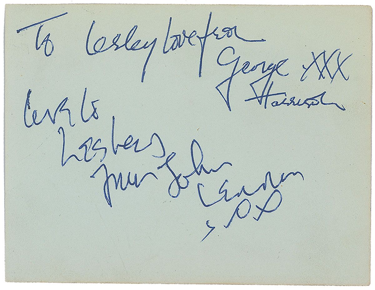 Exceptionally bold vintage ballpoint signatures and inscriptions, “To Lesley love from George Harrison xxx,” and “Love to Leslie from John Lennon xxx,” on a light green 5.25 x 4 album page. In fine condition.
