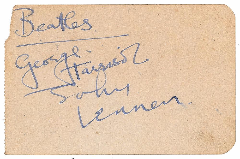 Attractive blue ink signatures, "Beatles, George Harrison" and "John Lennon," on an off-white 4.25 x 2.75 notebook page. In fine condition, with some light soiling and wrinkling. Accompanied by a letter of provenance from the son of the original recipient, in part: "My father (Derek Nunn) met George Harrison and John Lennon on a train from London Euston to Liverpool circa 1961/1962. He started talking with George and John during the journey and they informed him they were part of a band called the 'Beatles.' My father was not a follower of popular music but asked that they writes their names in a notebook so he could show it to his wife. My mother has kept the page ever since."