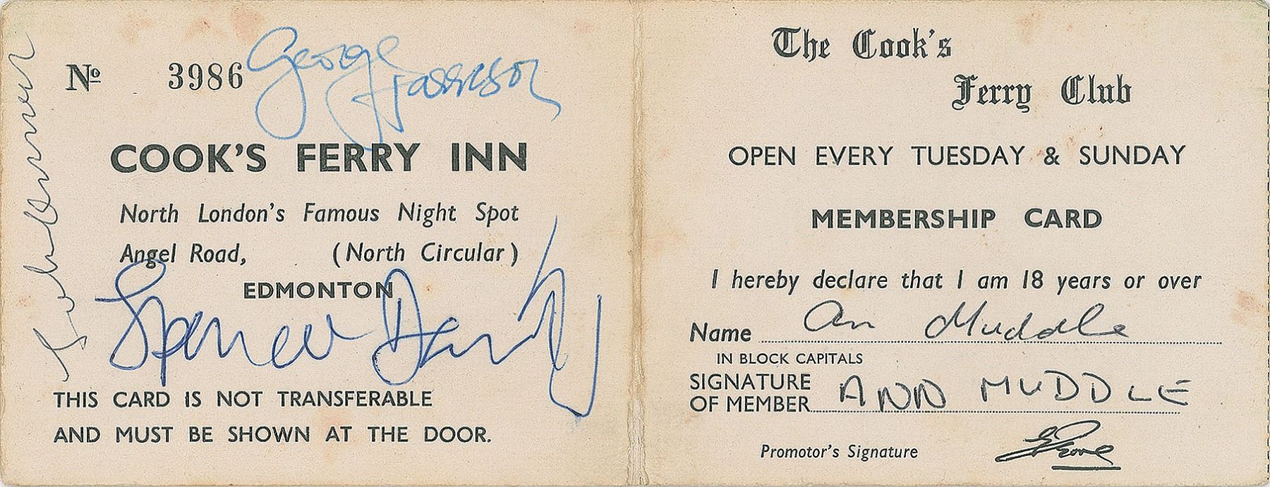 Vintage membership card for The Cook's Ferry Club at the Cooks Ferry Inn in Edmonton, England, measures 8 x 3 open, signed inside in black ballpoint by John Lennon, in blue ink by George Harrison, and in blue ballpoint by Spencer Davis. In fine condition, with light overall rippling. Accompanied by a certificate of authenticity from Tracks, as well as a letter of provenance from the original recipient, in part: "My friend and I were invited to meet John Lennon, George Harrison and Spencer Davis in 1967 at a preview of the Beatles film Magical Mystery Tour. Prior to the film, we enjoyed drinks and food with them, which is when they signed the membership card. During the film John Lennon sat close to me. When he later took my hand, after the movie, my false fingernails bent up in his hand and two or three came off in his hand! Much to John's amusement." A small package containing several of the recipient's 'false fingernails' is also included.