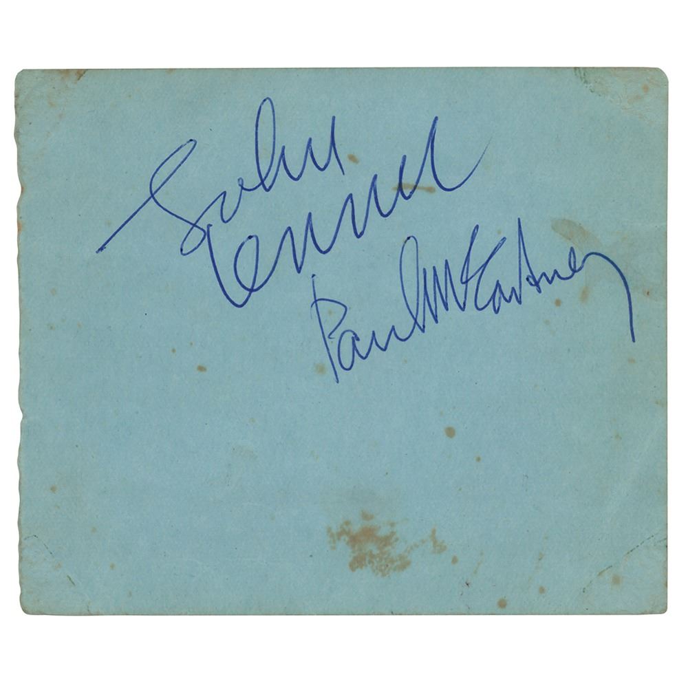 Bold ballpoint signatures of John Lennon and Paul McCartney on a blue 4.5 x 3.75 album page. The consignor notes that the autographs were obtained in Bournemouth, England between August 19-24, 1963, when the Beatles were in the town to perform a residency at the Gaumont Theatre. In very good to fine condition, with light creasing and scattered staining. Accompanied by a certificate of authenticity from Tracks, and by a letter of provenance from the daughter of the recipient, which reads: “The autograph of John Lennon and Paul McCartney was originally obtained by my father Mr. William Bunton. My father worked at the Pavilion Theatre in Bournemouth, John and Paul were staying in the Palace Court Hotel just opposite in 1963. My father saw them in the foyer of the Pavilion as they were looking at the posters/bills for the forthcoming shows. My father approached them to ask if they needed any assistance and then asked for their autograph.â€
