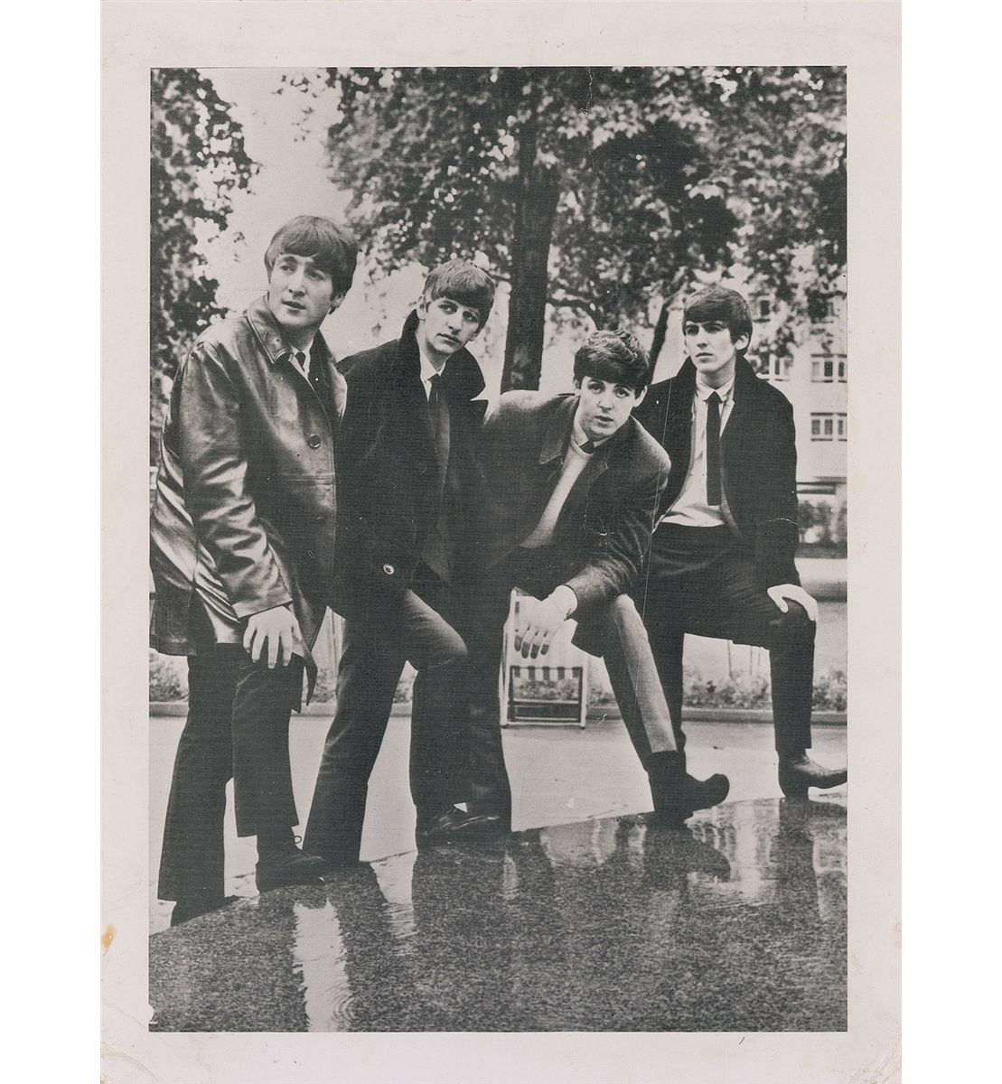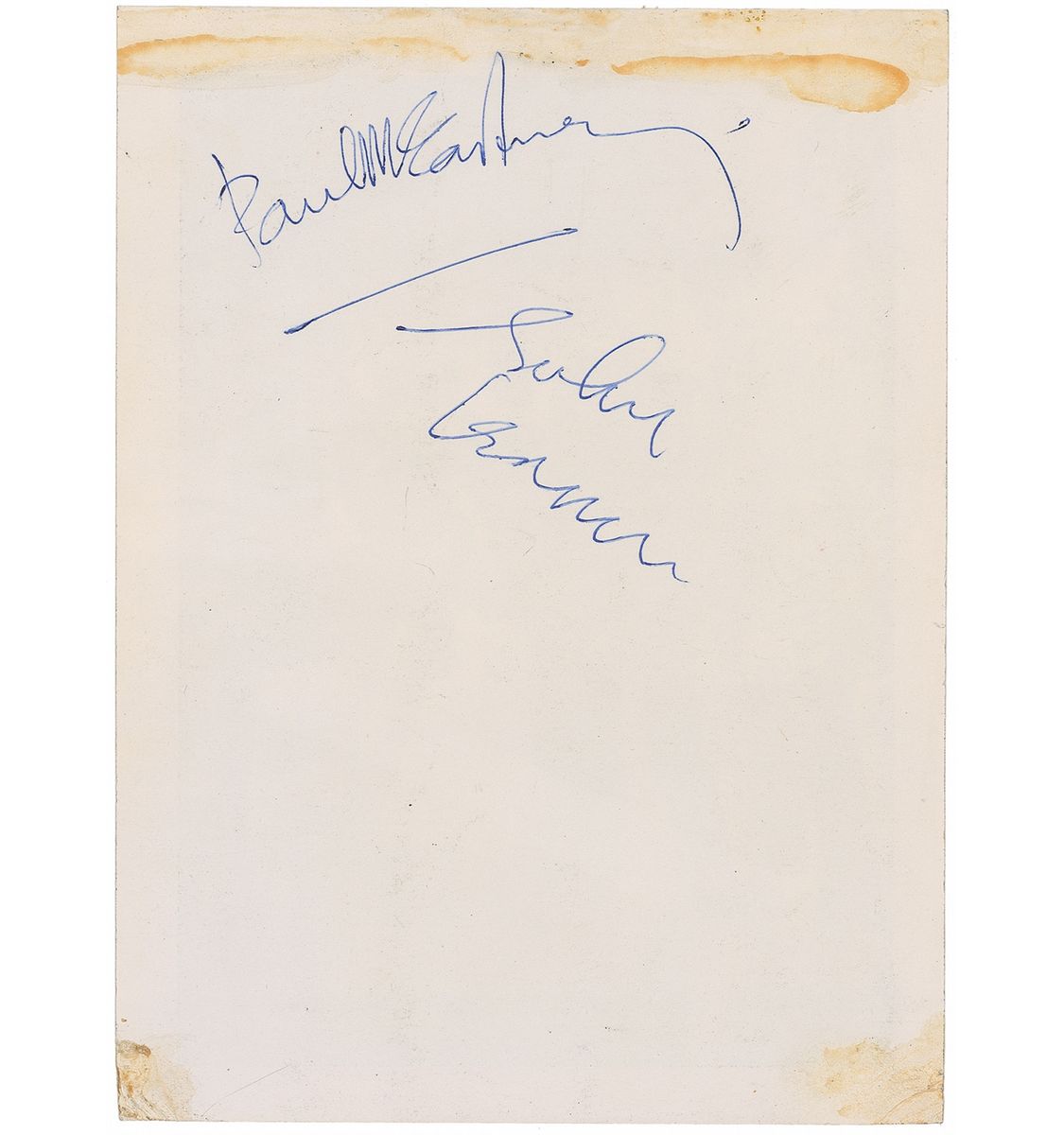 Desirable vintage 6 x 8 cardstock photo of the group issued as an insert for the Beatles 1963 autumn tour program, signed on the reverse in blue ballpoint circa late 1963 by John Lennon and Paul McCartney. In very good condition, with toned adhesive remnants to corners and top edge, and creasing to lower corners. Accompanied by a certificate of authenticity from Tracks.