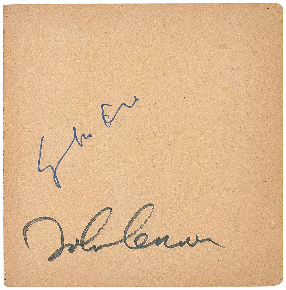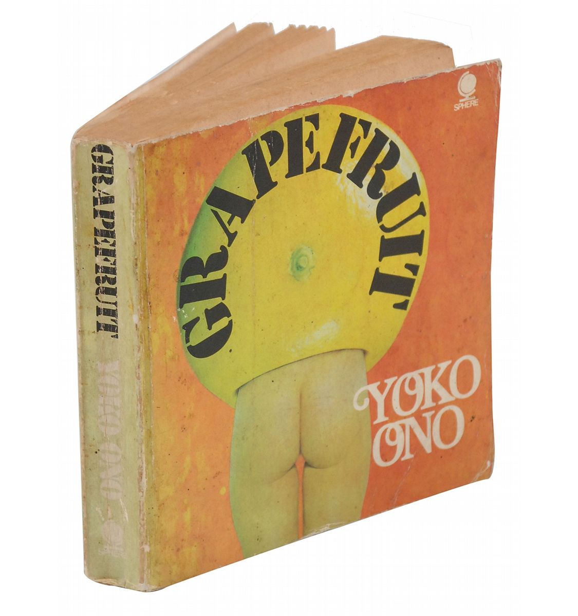 Signed book: Grapefruit. First Sphere Books edition. London: Sphere Books, 1971. Softcover, 5 x 5. Signed on the first free end page in black felt tip, “John Lennon,” and blue felt tip, “Yoko Ono.” Autographic condition: fine, with light overall toning to the signed page. Book condition: G+/None. Orange illustrated wraps; edges heavily worn; spine sunned and creased; few vertical creases down covers; rubbed and soiled; yellowed and lightly foxed throughout. Consignor notes that this was signed at the well-known book signing at Selfridges department store in London; the original recipient penned a brief poem on the reverse of the half-title page before sending it to her family, in full: “He is nice. She is too. And they send a smile to you. Hope you enjoy it, Londres, 16/7/71.”
