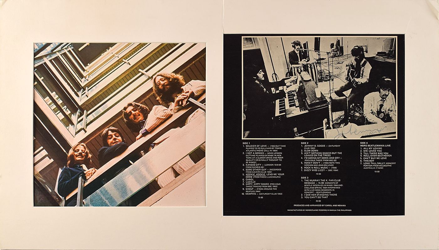 Wonderland Records bootleg Beatles album entitled Buried Treasure, signed on the back cover in black ballpoint by John Lennon and Yoko Ono. Matted with an album cover, similar to how the Beatles are pictured on the back cover of the 1962-1966 (Red Album), to an overall size of 29 x 16.5; window to reverse of mat reveals the front cover of Buried Treasure. In fine condition.