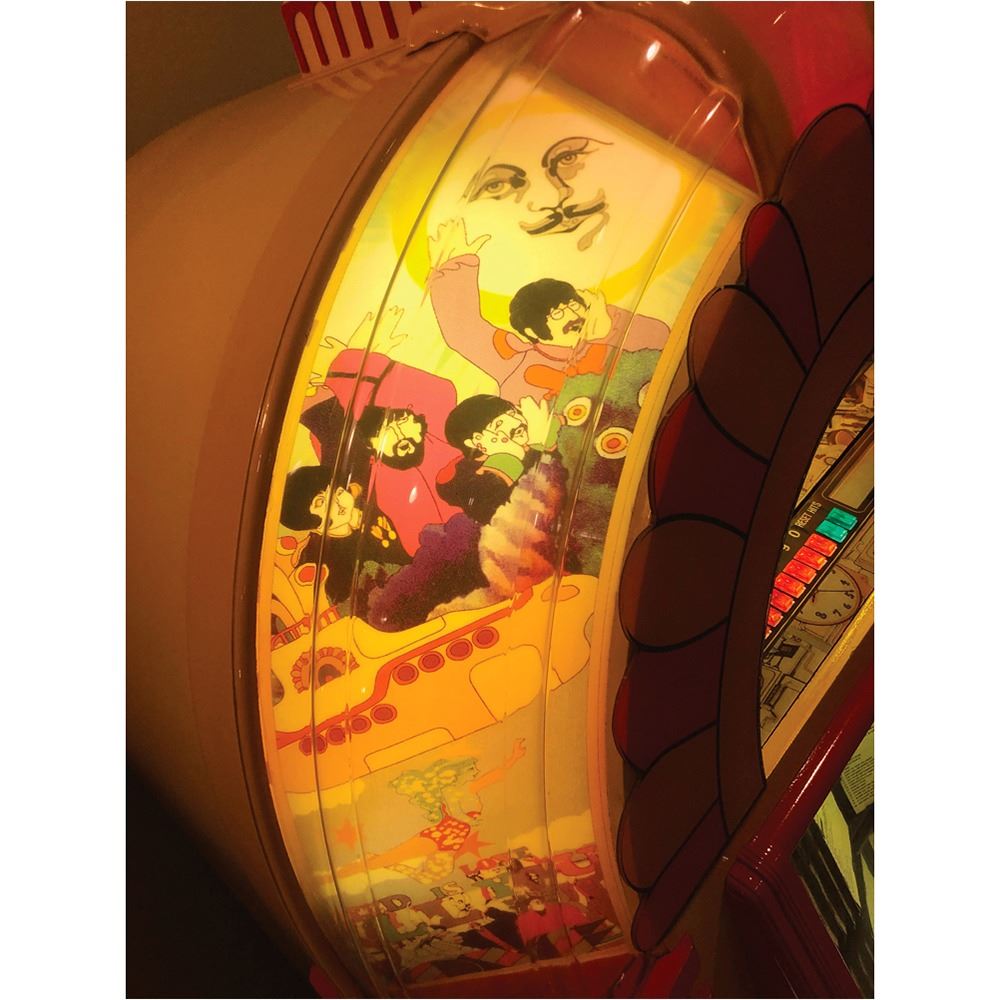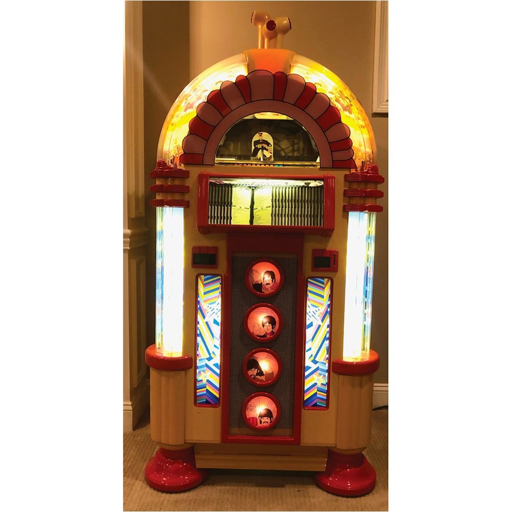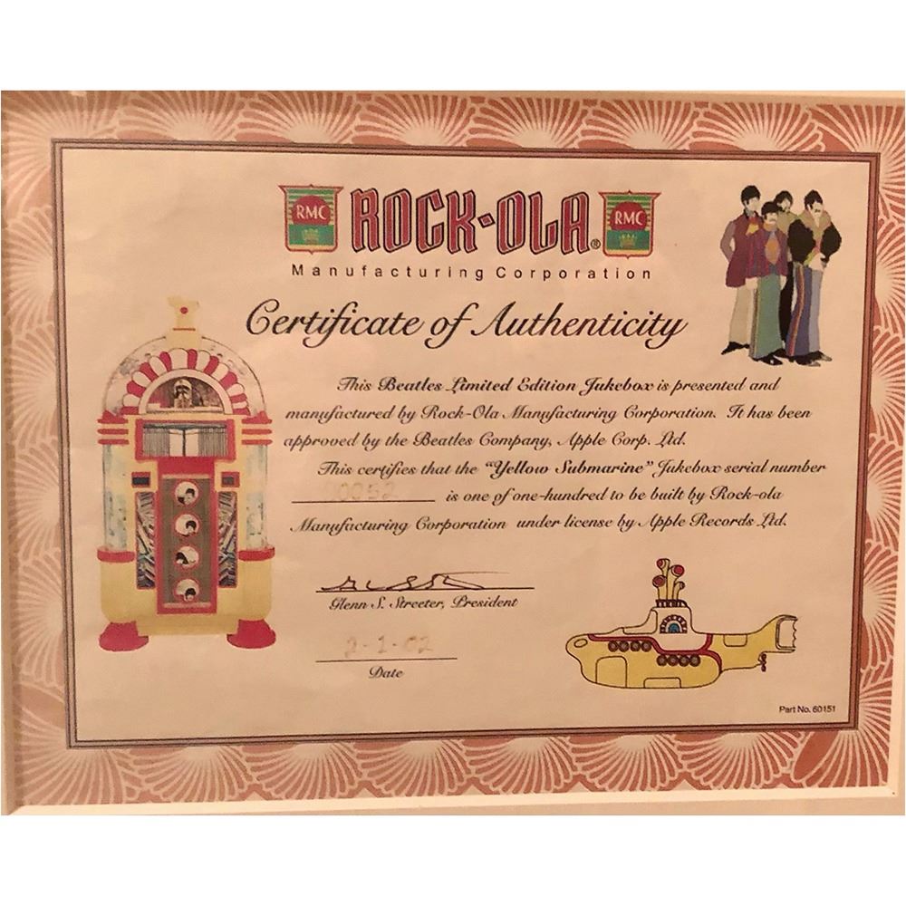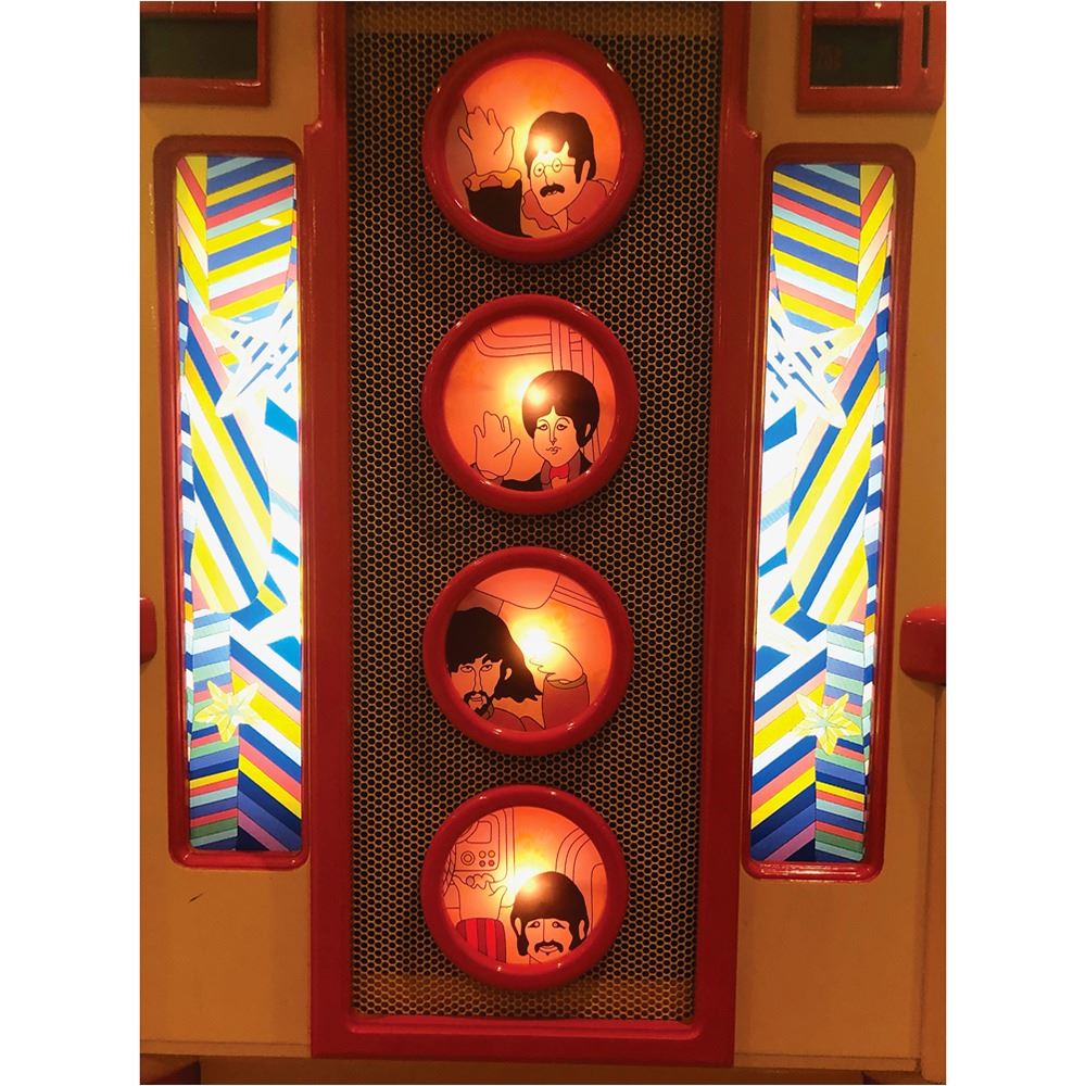 Rare Beatles 'Yellow Submarine' jukebox made in 2001 by Rock-Ola in a limited edition of 100, serial no. 90052, featuring an 'electric yellow' finish and the Yellow Submarine cartoon versions of John Lennon, Paul McCartney, George Harrison, and Ringo Starr peering through portholes on the front. The handcrafted cabinet features die-cast metal trim, with rotating side panels that display vivid graphics from the famous film, including the submarine, various creatures and characters, and other related scenery. A group of four funky periscopes surmounts the jukebox, and air bubbles travel through four tubes. Technical specifications include a 100 CD capacity magazine, an LCD display, Sybersonic Computer system, 360 watt dual stereo amplifier (developing over 800 watts peak music power), and Surround Sound system with (1) 10" DVC subwoofer and (2) 4" two-way coax midrange/tweeters. It measures approximately 33 1/2˝ x 72˝ x 26 3/4˝, and weighs 360 lbs. Accompanied by the original Rock-Ola certificate of authenticity, noting that the jukebox was approved by the Beatles Company, Apple Corp. Ltd.