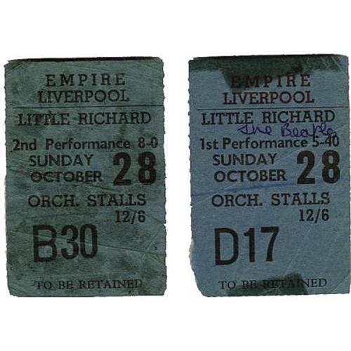 <B>Beatles/Little Richard Concert Tickets.</B></I> Two ticket stubs from the Beatles October 28, 1962, performance at the Empire Theatre -- their first appearance at the top theater in Liverpool and their first pop package show. Headlining the show was none other than Little Richard. The stubs are in Very Good condition with moderate wear, creasing, and staining.<BR><BR><b>Shipping:</b> Flat Material, Small (<a target="_blank" href="http://www.heritageauctions.com/common/shipping.php">view shipping information</a>)