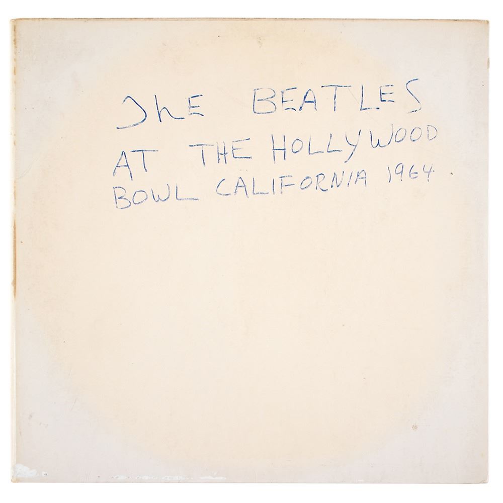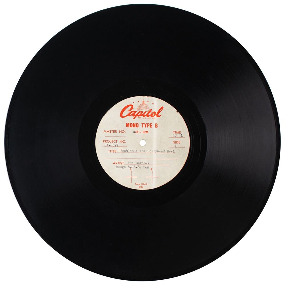 Exceedingly rare double-sided mono Capitol Records 33 1/3 RPM acetate of the complete Beatles ‘Live at the Hollywood Bowl’ concert. Both labels are marked “Title, Beatles & The Hollywood Bowl,†“Artist, The Beatles,†and “Project No. 31-4877,†with respective running times of “Time, 13:41, Side 1†and “Time, 15:58, Side 2.†The section marked “Rough 8-26-64 Don,†indicates that the acetate was cut directly from the reel-to-reel tape on August 26, 1964, just three days after the concert was recorded. The acetate features the full 29-minute concert with a total of 12 tracks and all on -stage comments from the Beatles. The contents of the record: ‘Twist and Shout,’ ‘You Can’t Do That,’ ‘All My Loving,’ ‘She Loves You,’ ‘Things We Said Today,’ ‘Roll Over Beethoven,’ ‘Can’t Buy Me Love,’ ‘If I Fell,’ ‘I Want to Hold Your Hand,’ ‘Boys,’ ‘A Hard Day's Night,’ and ‘Long Tall Sally.’ Capitol gave the live recording a project number (“4877â€) and the recording was mixed by Capitol producer Voyle Gilmore and balance engineer Hugh Davies. However, Brian Epstein, George Martin, and the Beatles were not fully satisfied with the results and the project was scrapped. Includes a white paper album sleeve marked “The Beatles at the Hollywood Bowl California 1964.†In very good condition, with some scratching to both sides of the vinyl, which, according to the consignor, play very well. Accompanied by a certificate of authenticity from Tracks.