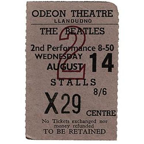 <B>Beatles Llandudno Concert Stub.</B></I> A used ticket to the band's August 14, 1963, second evening performance at the Odeon Theatre in Llandudno, Caernarvonshire. The show was part of a six-night, 12-show stint at the venue. In Excellent condition.<BR><BR><b>Shipping:</b> Flat Material, Small (<a target="_blank" href="http://www.heritageauctions.com/common/shipping.php">view shipping information</a>)