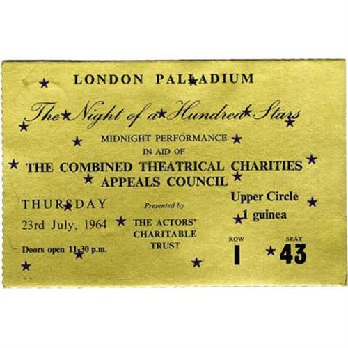 <B>Beatles London Palladium Concert Ticket.</B></I> Used ticket to the Beatles' July 23, 1964 "The Night of a Hundred Stars" midnight revue, an aid performance that benefited the Combined Theatrical Charities Appeals Council. The show featured a number of illustrious celebrities -- including Sir Laurence Olivier and Judy Garland -- and featured a "flying ballet" sketch by the Beatles that involved their being hoisted above the stage, as well as a short musical set later in the evening. The ticket is in Very Fine to Excellent condition, with one small tape pull on the back.<BR><BR><b>Shipping:</b> Flat Material, Small (<a target="_blank" href="http://www.heritageauctions.com/common/shipping.php">view shipping information</a>)