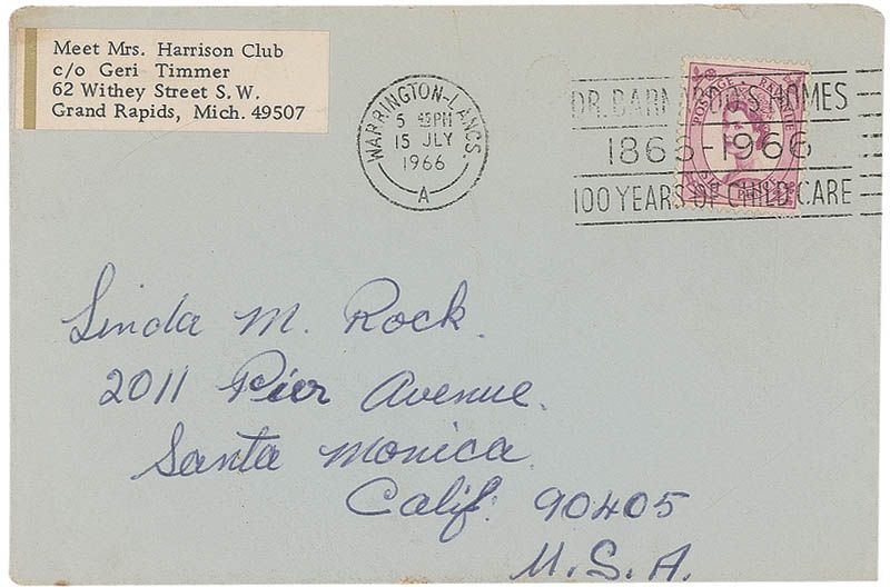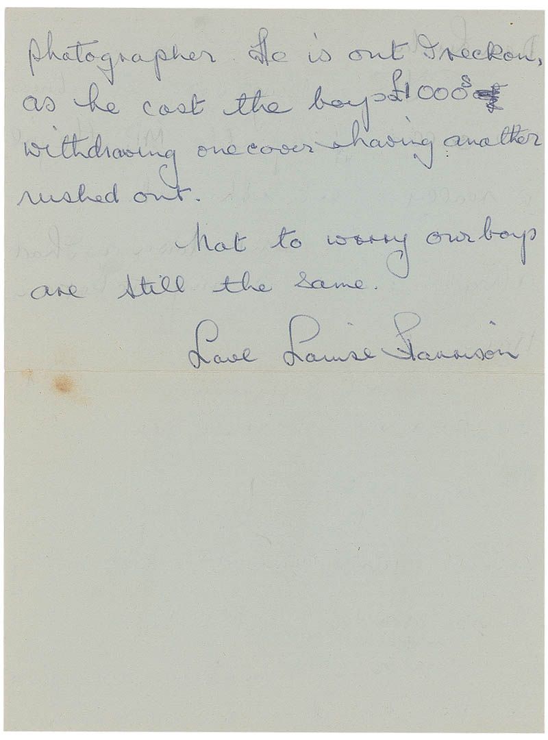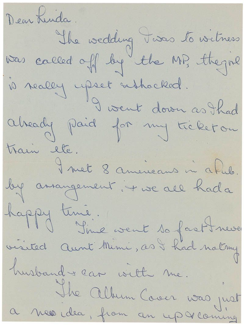 ALS, one page both sides, 5.25 x 7, no date but postmarked July 15, 1966. Letter to an American fan. In full: “The wedding I was to witness was called off by the MP, the girl is really upset & shocked. I went down as I had already paid for my ticket on train etc. I met 8 Americans in a pub by arrangement & we all had a happy time. Time went so fast I never visited Aunt Mimi as I had not my husband & car with me. The album cover was just a new idea from an up & coming photographer. He is out I reckon, as he cost the boys £1000 withdrawing one cover & having another rushed out. Not to worry our boys are still the same.” In fine condition, with light scattered creases and a spot of soiling. Accompanied by the original mailing envelope. Yesterday and Today had just been released at the end of June, so this letter was written shortly after the controversy occurred.