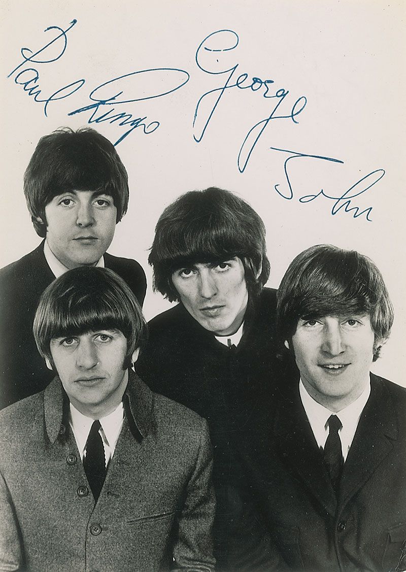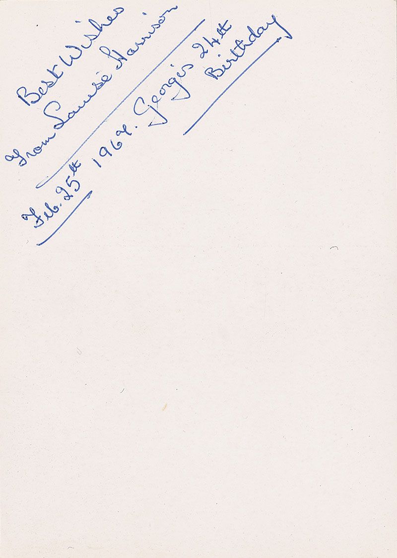 Glossy 4.25 x 6 Beatles promotional photo, bearing pre-printed signatures of the band, signed on the reverse in blue ballpoint, “Best Wishes From Louise Harrison, Feb 25th 1967. George’s 24th Birthday.” In fine condition, with some light surface impressions from Harrison’s writing to front. Accompanied by a certificate of authenticity from Tracks.