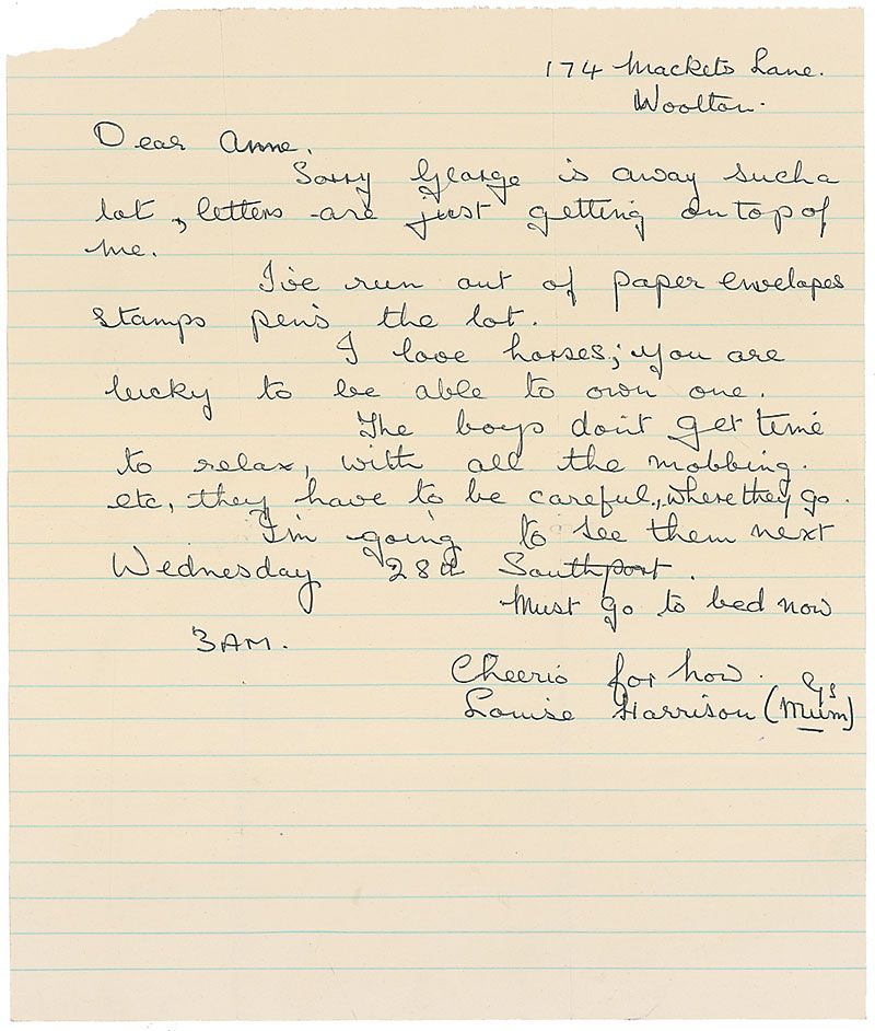 ALS signed “Louise Harrison (Gs Mum),” one page, lightly-lined, 8 x 9.5, no date. Letter to a Beatles fan. In part: “Sorry George is away such a lot, letters are just getting on top of me…The boys don’t get time to relax, with all the mobbing etc., they have to be careful where they go.” In fine condition, with intersecting folds and missing top left corner tip. Accompanied by the original mailing envelope, postmarked August 22, 1963, and also accompanied by a certificate of authenticity from Tracks.