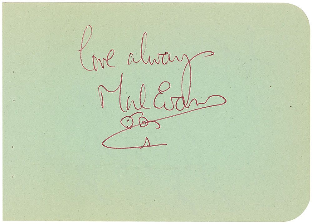 Road manager, studio assistant, and friend of The Beatles (1935–1976). Vintage ballpoint signature, “Love always, Mal Evans,” on a light green 5.25 x 3.75 album page. In fine condition.