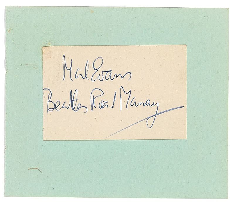Road manager, assistant, and friend of the Beatles (1935-1976) who contributed to several of their recordings. Vintage ballpoint signature, "Mal Evans, Beatles Road Manager,” on an off-white 3 x 2 slip affixed to a slightly larger album page. In fine condition.