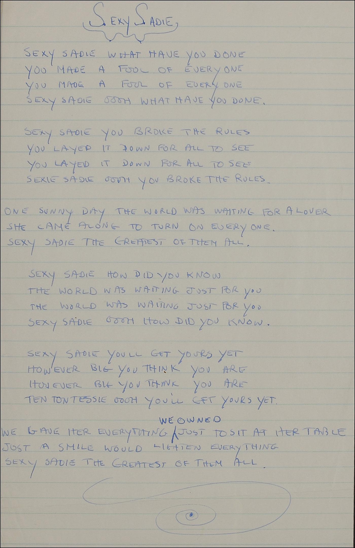Handwritten lyrics to “Sexy Sadie,” written out by Mal Evans, on an off-white 7.5 x 12 lightly-lined sheet sheet. This lyric sheet was used in the Abbey Road Studios for the song which appears on The White Album. Evans has written out the song title and 22 lines from the song. Accompanied by a letter of authenticity from noted Beatles expert Frank Caiazzo, stating “This sheet was no doubt used in the studio recording session for the song, making this a special piece of Beatles memorabilia.” Triple matted and framed with a color portrait of John to an overall size of 22.75 x 18.5. In fine condition, with a mild shade of overall toning, and a bit of light soiling. Pre-certified Roger Epperson/REAL and RRAuction COA.