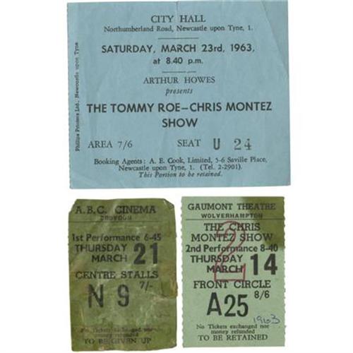 <B>Beatles March '63 Ticket Stubs, Group of 3.</B></I> Included are used tickets for the following Beatles performances during the 1963 Chris Montez Show tour: Gaumont Theatre, March 14; ABC Cinema, March 21; and the Newcastle Upon Tyne City Hall, March 23. Items are in overall Fine to Very Fine condition with heavy wear and discoloration to the March 21 ticket.<BR><BR><b>Shipping:</b> Flat Material, Small (<a target="_blank" href="http://www.heritageauctions.com/common/shipping.php">view shipping information</a>)