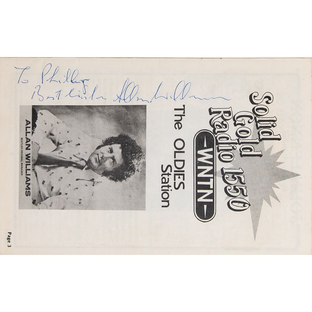 Four items signed by Beatles band members and associates, including: two identical cardstock 11 x 8.5 photos of the Band in their Hamburg days, both signed in black felt tip by original drummer Pete Best; a color glossy 5 x 3.75 photo of the 'Fifth Beatle' George Martin, signed in black felt tip by the legendary record producer; and a souvenir booklet from the '2nd Annual Boston Beatles Convention,' signed and inscribed inside in blue ballpoint by their first manager, Allan Williams. In overall fine condition.