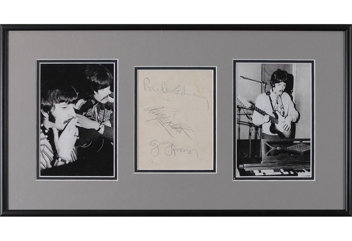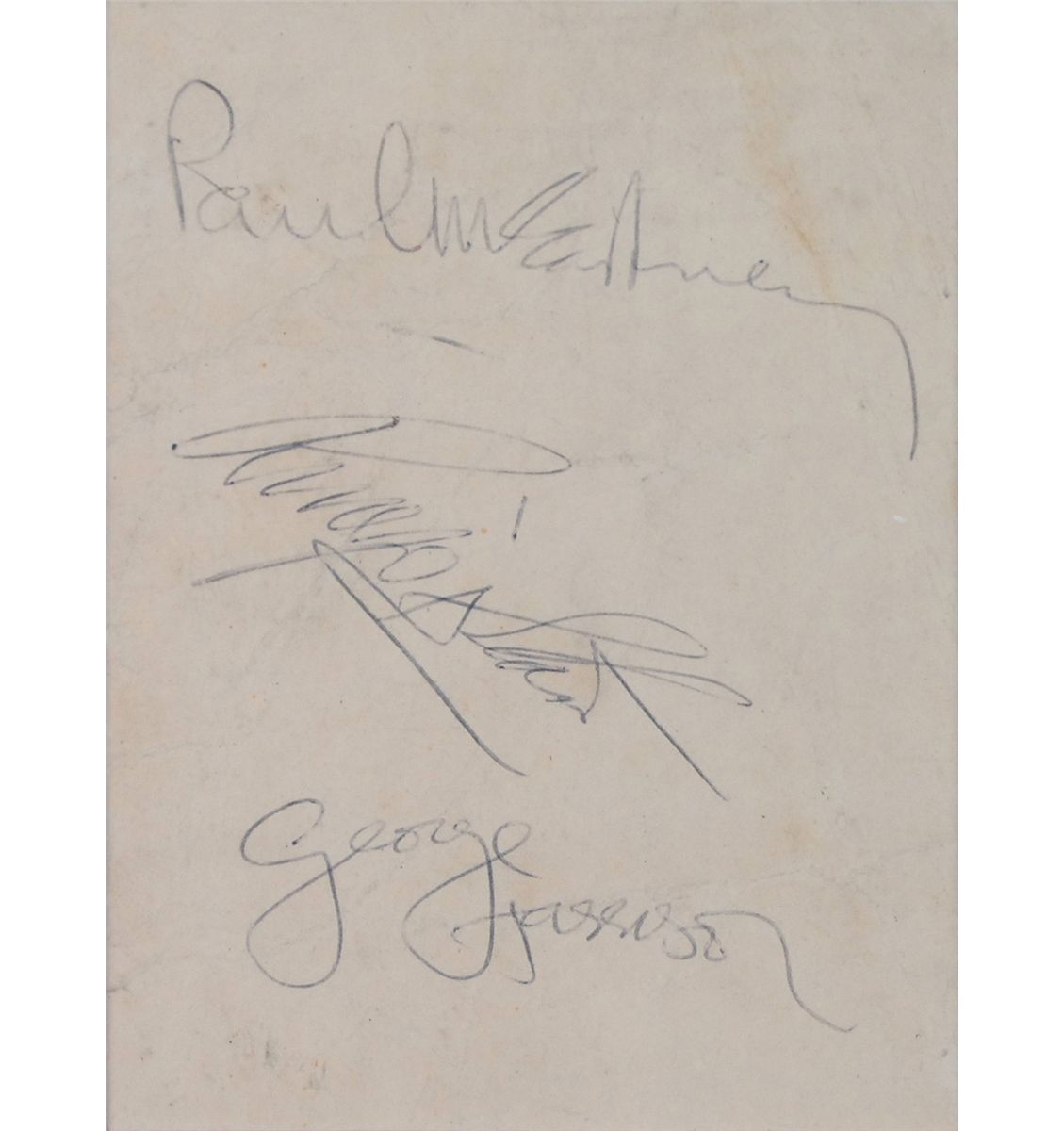 Vintage ballpoint signatures, “Paul McCartney,” “Ringo Starr,” and “George Harrison,” on an off-white 3.75 x 5.25 sheet. Double-matted and framed with two photos of the three signers to an overall size of 18 x 9.75. In very good condition, with moderate creases, some through portions of signatures, and scattered soiling. Accompanied by a 2007 letter of appraisal from noted Beatles expert Frank Caiazzo, who states: “These signatures date from 1968, and as such are extremely rare, because the Beatles signed very few items that year.” Any signatures from this late in the band’s career are particularly scarce, as all touring had ceased two years earlier.