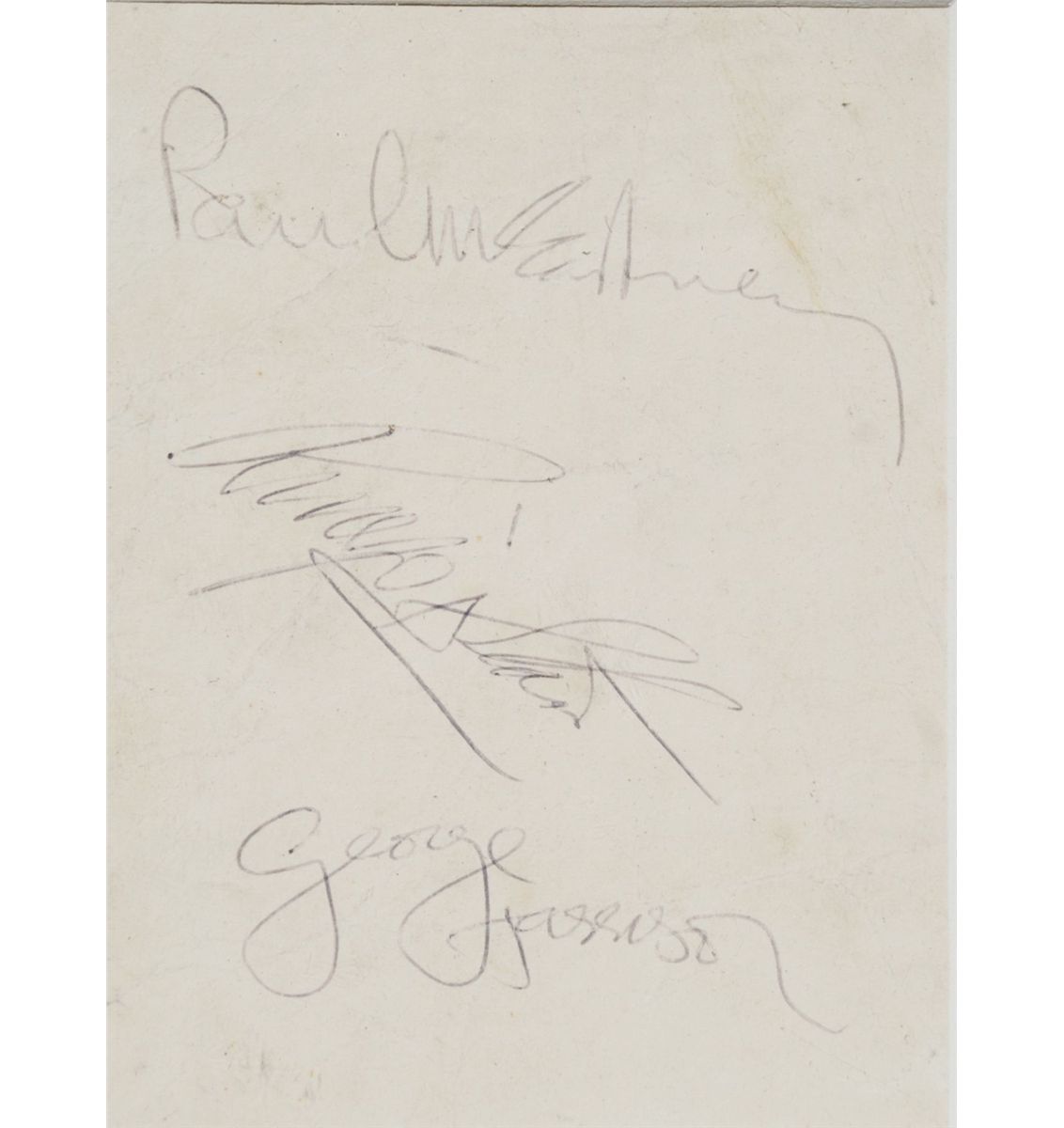 Vintage ballpoint signatures, "Paul McCartney." "Ringo Starr: and "George Harrison: on an off-white 3.75 x 5.25 sheet Double-matted and framed with two photos of the three signers to an overall size of 18 x 9.75. In very good condition, with moderate creases, some through portions of signatures, and scattered soiling. Accompanied by a 2007 letter of appraisal from noted Beatles expert Frank Caiazzo, who states: