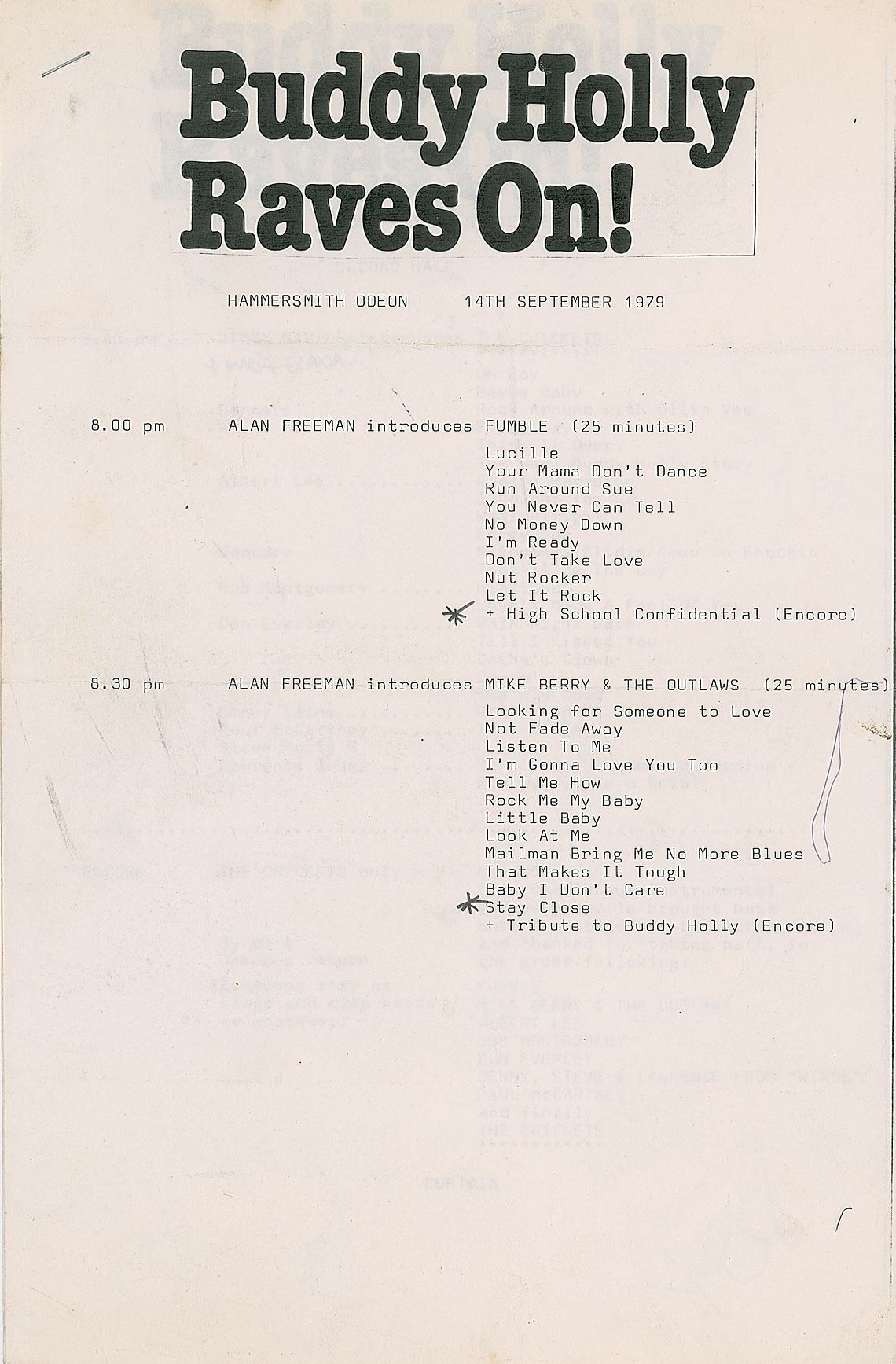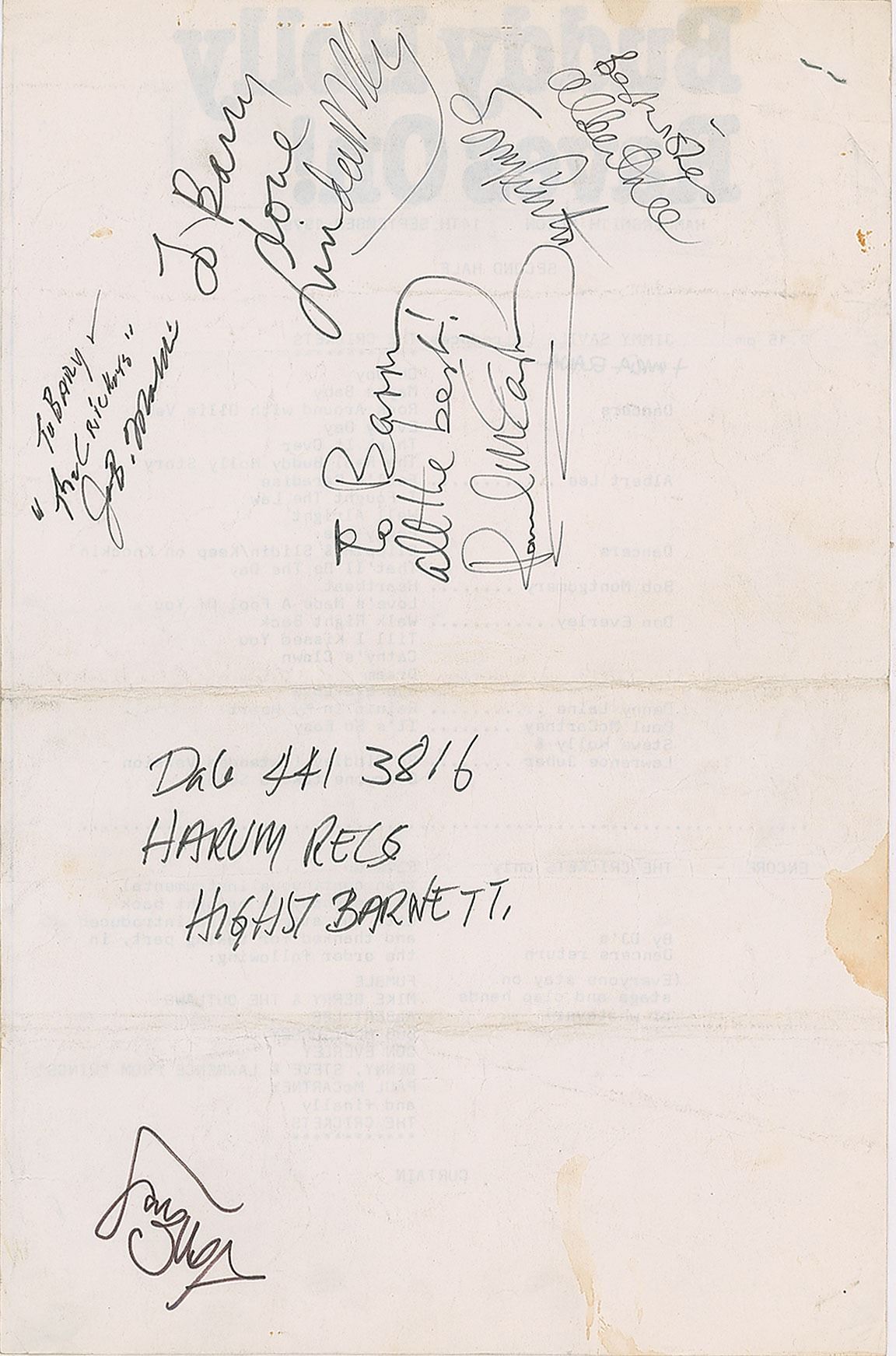 Printed itinerary for the ‘Buddy Holly Raves On!’ finale concert held at the Odeon Theatre in Hammersmith, London on September 14, 1979, two pages, 8.5 x 13, signed and inscribed on the reverse of the second page in black felt tip, “To Barry, all the best! Paul McCartney,” “To Barry, Love, Linda McCartney,” “Best wishes, Albert Lee,” “Sonny Curtis,” “Don Everly,” and one other. In very good to fine condition, with overall creasing and some light stains. Accompanied by a certificate of authenticity from Tracks.