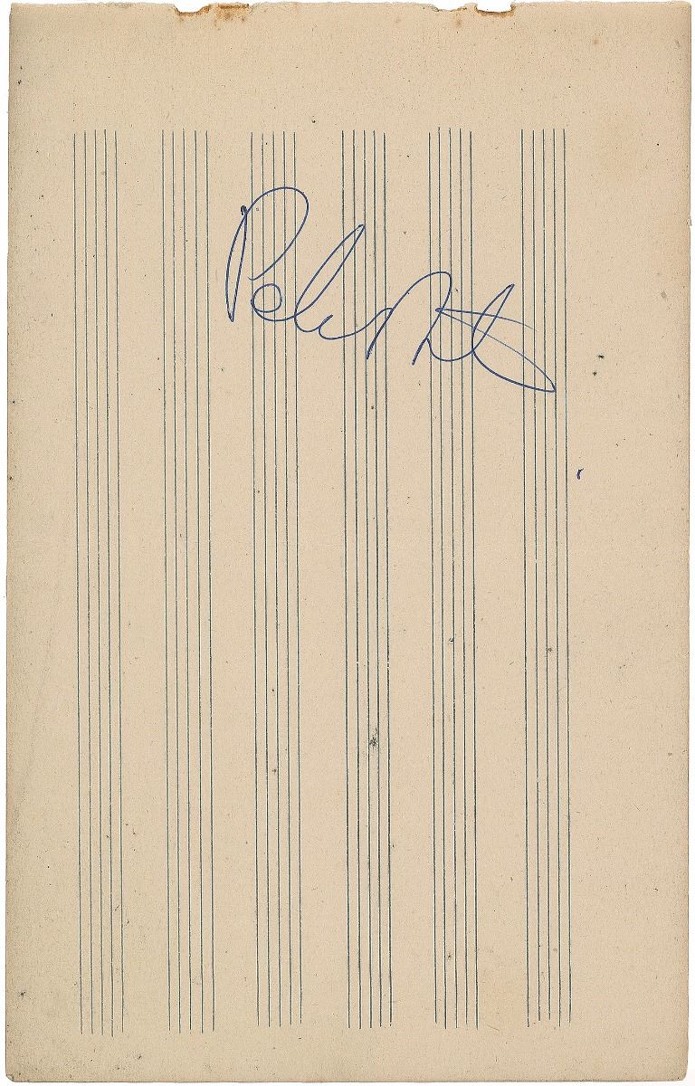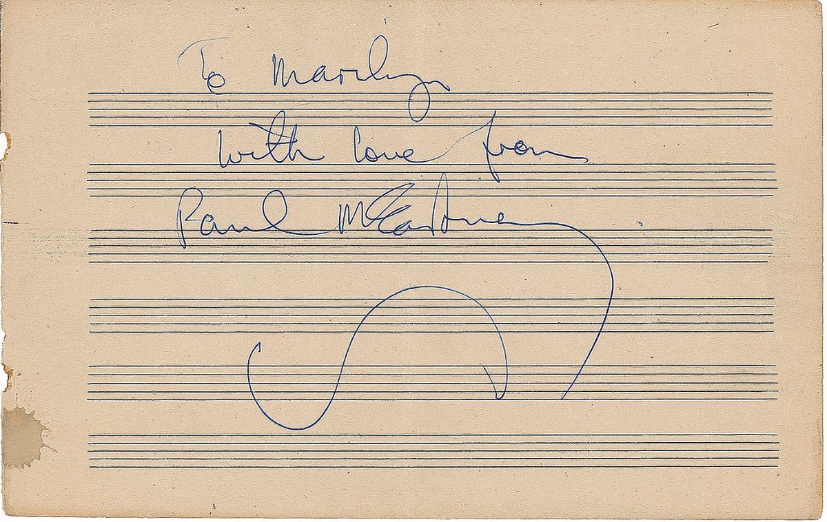 Pair of ballpoint signatures, “To Marilyn, with love from, Paul McCartney” and “Peter Asher,” on individual off-white 9.25 x 5.75 lightly-lined pages removed from a musician’s book. In overall fine condition, with a central horizontal fold. Accompanied by a letter of provenance from the wife of the original recipient, in part: “I got Paul McCartney’s autograph many years ago. My late husband playing in Black Dyke Mills Band, who were asked to provide brass backing on ‘Yellow Submarine,’ The Beatles came up to Yorkshire to record with Black Dyke. I was there and had a great time, lots of laughing & fooling around with the lads, I even played a couple of notes on my cornet—but couldn’t record because at that time women were not allowed to play in the band at that time, in the late 60s.” The signatures were obtained in Saltaire, Yorkshire, England on June 30, 1968, when Paul McCartney traveled there with Peter Asher, Derek Taylor, and Tony Bramwell to record the brass section for ‘Yellow Submarine’ and also ‘Thingumybob,’ songs that would soon be released as an Apple Records single on September 6, 1968.
