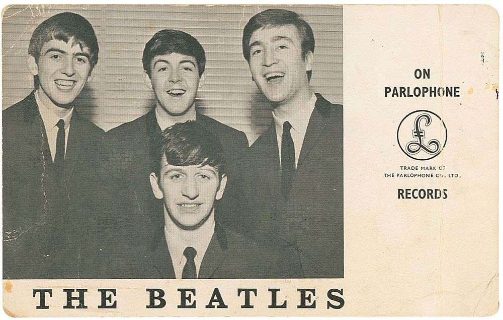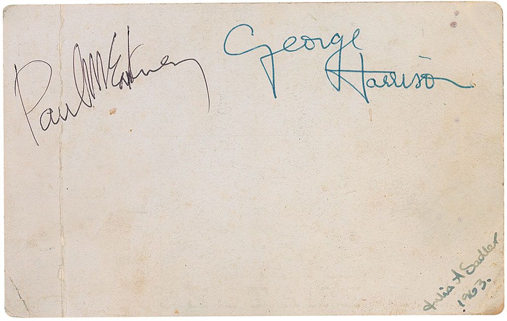 Vintage 6.25 x 4.5 Parlophone promo card of the Beatles from March of 1963, featuring a charming image of the band in matching suits, signed on the reverse in black ballpoint, “Paul McCartney,” and in blue ballpoint, “George Harrison,” with a small collector’s notation to lower right corner. In very good condition, with a vertical crease though one letter of McCartney’s signature, some other scattered light creases to both sides, and some light toning and soiling. Accompanied by a letter of authenticity from noted Beatles expert Frank Caiazzo stating the signatures date from within a month of the card’s issuance, as well as a letter of authenticity from Beatles expert Perry Cox.