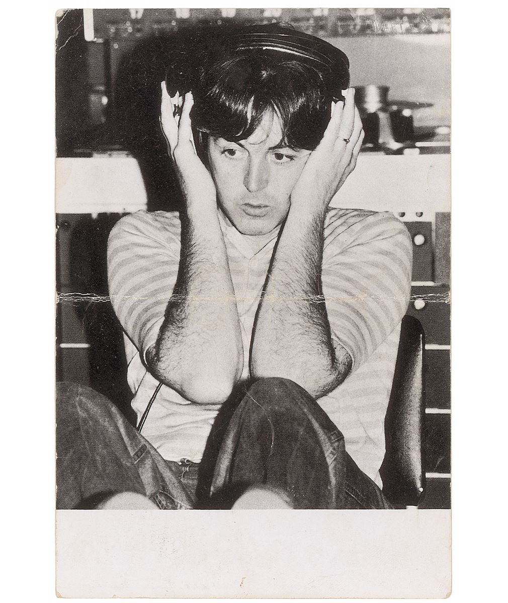 MPL Communications 4 x 6 postcard photo from 1982 showing McCartney wearing headphones, signed on the reverse in blue ballpoint, “Paul McCartney” and “George Martin.” An address has been added on the right side in another hand. In very good condition, with a heavy crease through the center and light overall creasing and soiling. Accompanied by the original mailing envelope and a promotional pin for McCartney’s 1982 album Tug of War. Accompanied by a certificate of authenticity from Tracks, stating that the original recipient attended the filming of the music video for ‘Take It Away’ through the Wings fan club.