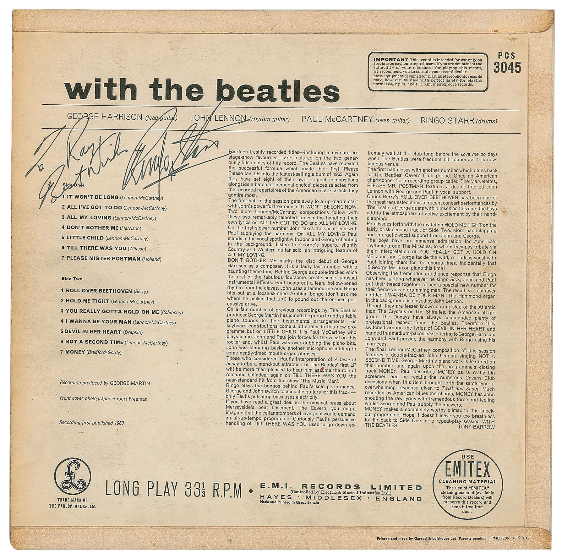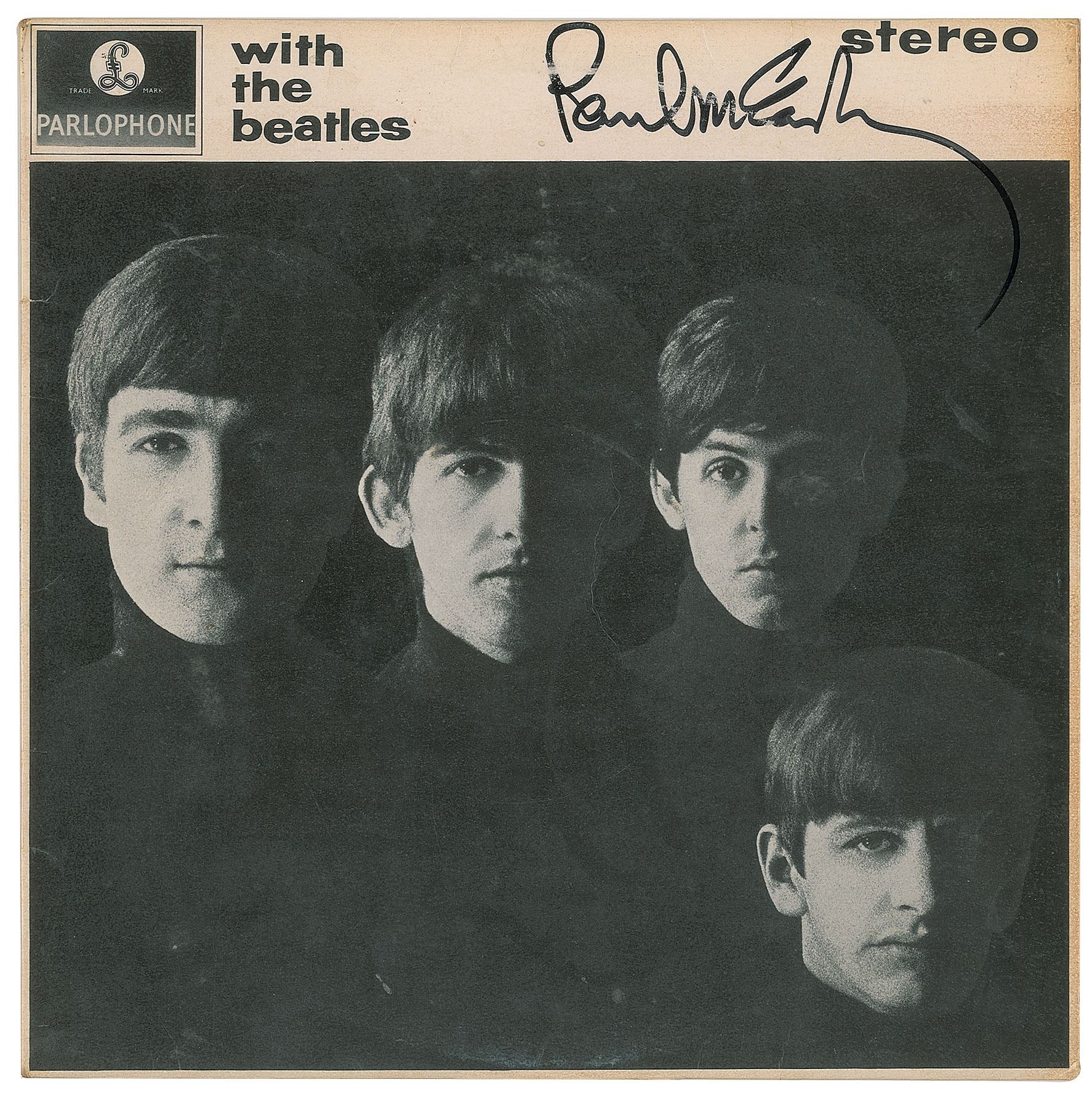 UK first pressing album of With the Beatles, signed boldly on the front cover in black felt tip, "Paul McCartney," and signed and inscribed on the back cover in black ink, "To Ray, Best wishes, Ringo Starr." In very good to fine condition, with some light soiling and toning, and minor lifting to the emulsion on the front. The record is included. Consignor notes that the signatures were obtained on the set of Paul McCartney’s 1984 film Give My Regards to Broad Street. Accompanied by a certificate of authenticity from Tracks.